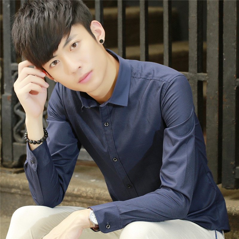 韓國進口2016春秋新款微領男式襯衣長袖修身全棉純色打底襯衫男裝