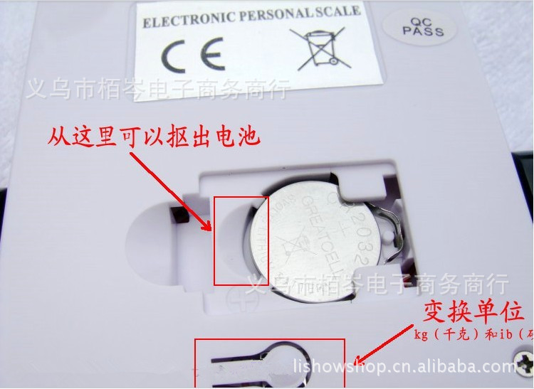 1.打開電子稱背面的電池蓋,取出壓在電池下的塑料墊片,將電池正確安裝好,把開關檔調至KG檔