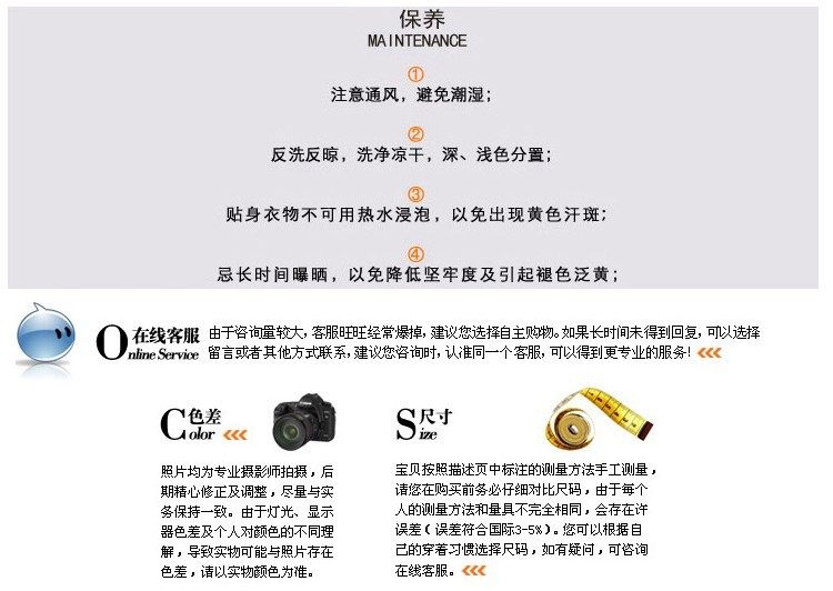 2.色差:由於拍攝技術、角度、天氣等原因,寶貝圖片與實物有一定的差距,但不影響寶貝的真實性,請您放心購買。