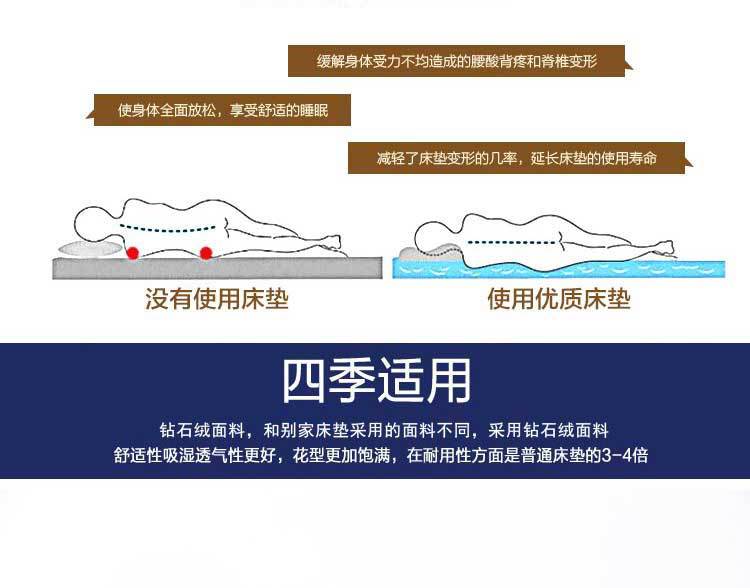 ⑵保持清潔。使用床墊時,應套上床單(床笠),並定期使用吸塵器清理床墊,將床墊上殘留的皮屑、毛發等清乾凈;避免洗完澡後或流汗時立即躺臥其上,以保持床墊的清潔,使其更為舒適耐用。