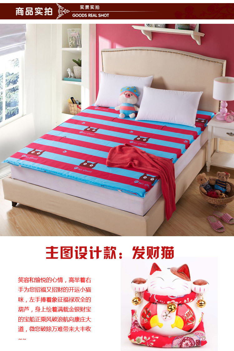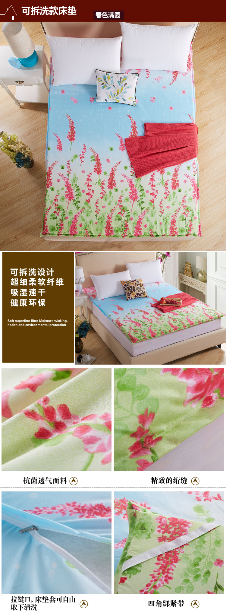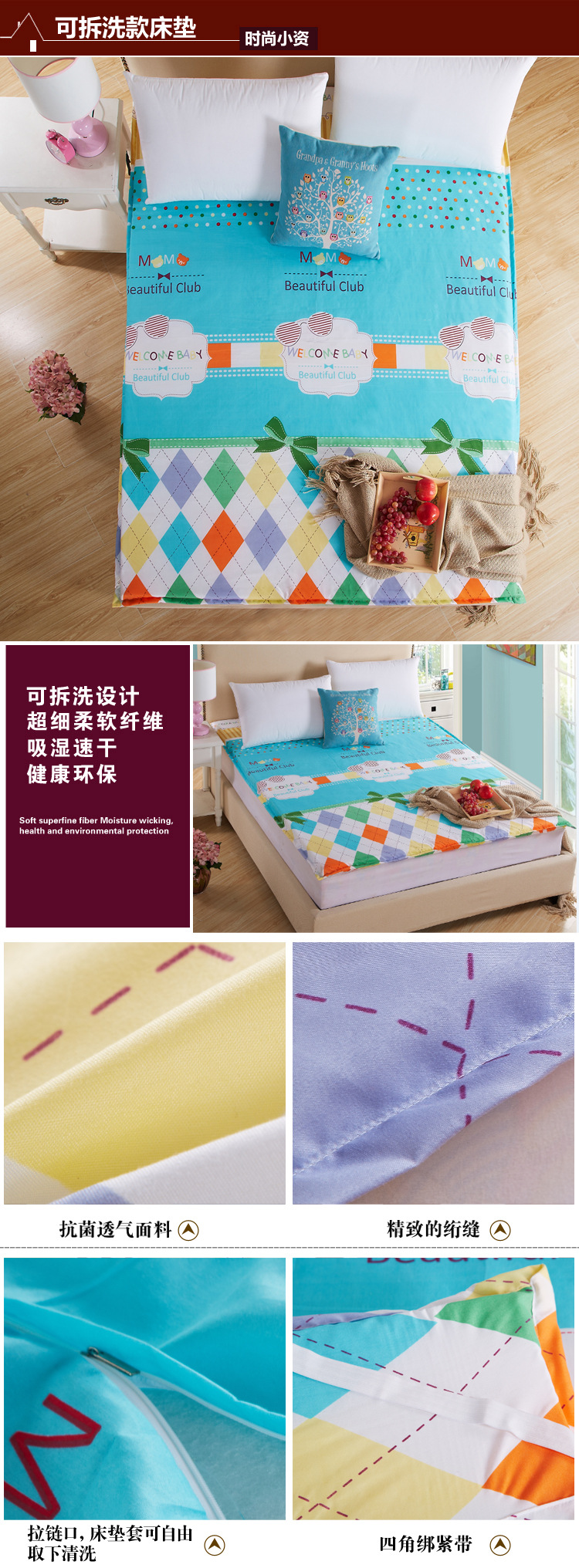 特點:可拆洗,保暖透氣,舒適保健,經久耐用,可放於席夢思上.也可以直接放於地板上使用.折疊方便,便於收藏.按生理學原理設計,結構合理.具有排濕,吸濕的功效,不斷棉,不跑棉,保持一定的硬度的同時又有良好的彈性.(性價比超高的一款床墊)