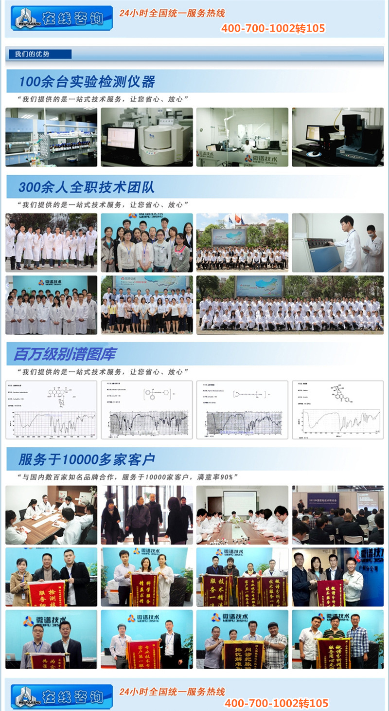 【配方還原】:通過分析檢測還原各類配方成分,確定各物質名稱,百分比含量; 【產品研發】:客戶提供市麵上尖端產品,輔助客戶研發新型、高效的產品。 【性能改進】:對比兩種樣品,找到決定產品性能的關鍵成分,實現改進的目的; 【成本控製】:對比同行產品,優化配方投料,在性能不變的前提下降低成本; 【模仿生產】:分析目標樣品配方,提供選材參考,通過反復調試生產類似產品; 【瞭解原材料】:分析原材料成分組成,尋找替代品,關鍵原料不再受供應商控製。 【微譜檢測】:提供化學品元素含量、物理化學性能測定、產品檢測認證、ROHS、REACH等各項標 準測試服務。 |