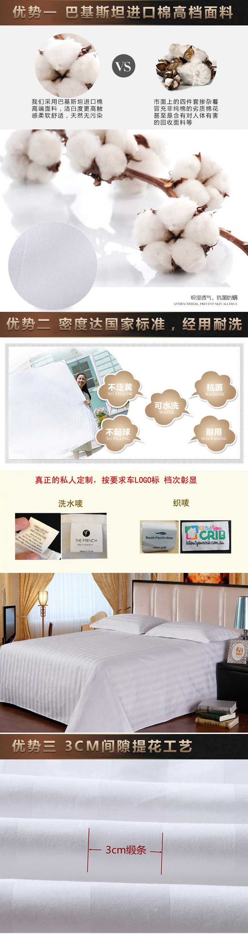 四、酒店床上用品套件: 滌棉條紋 全麵條紋 全麵貢緞 全棉提花