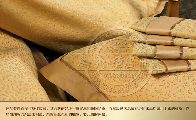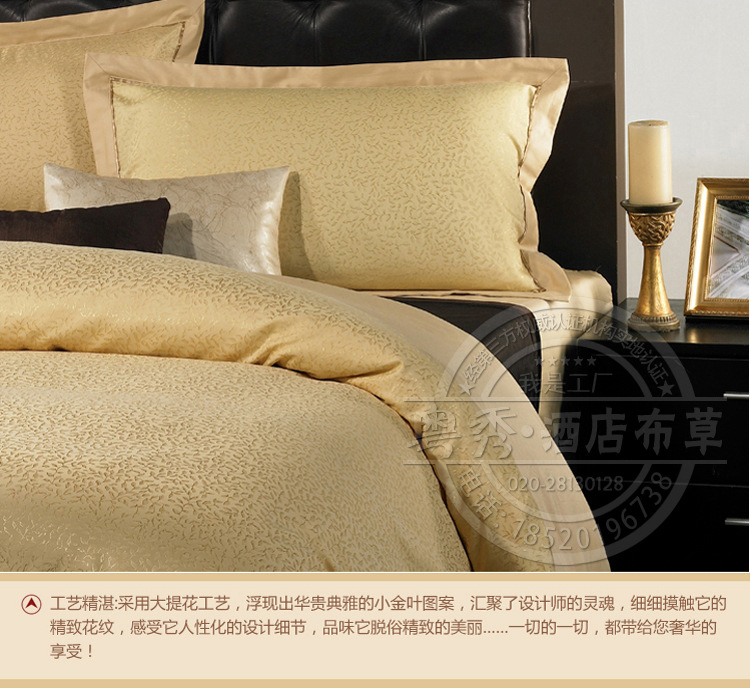 ![]() | 品 名:酒店床上用品四件套 品 牌:粵秀 貨 號:021 小金葉四件套 四件套:被套*1+床單/床笠(二選一)*1+枕套*2 材 質:全棉 工 藝:平紋、提花、刺繡、活性印染 尺 寸:1.2米床/1.5米床/1.8米床/2米床 (其它尺寸可根據客戶要求定做) 顏 色:白色(其它顏色請與客服聯系) 包裝:PP袋+纖維袋(如需特殊包裝,請與客服聯系) 用 途:酒店客房、賓館客房、展廳、公寓、會議、傢居等等 產 地:廣州