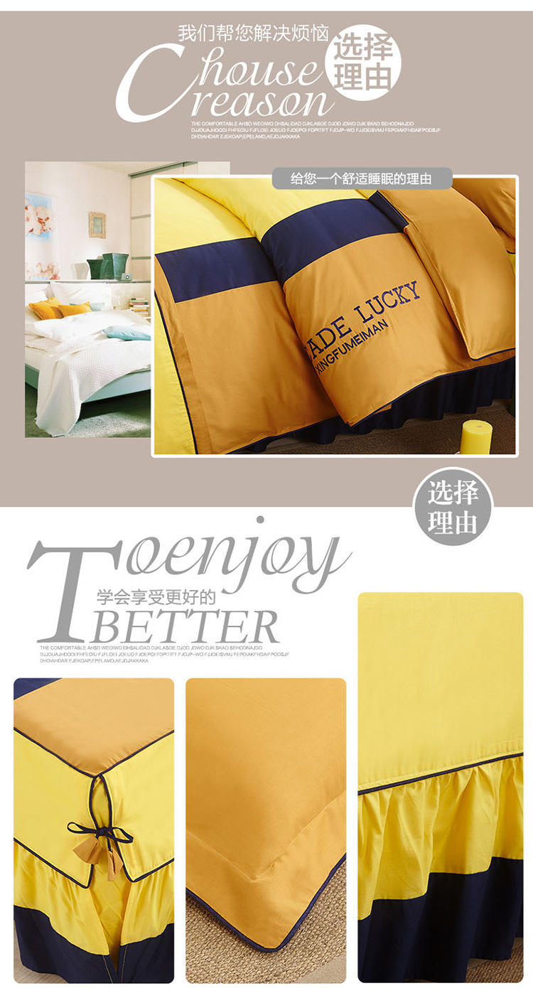 這款產品是高檔拼色繡花床裙四件套,麵料為100%全棉,133*72高支高密的佈料,特性:永久不褪色、不起球、不變型、柔軟舒適,真正貼身床品。4款尺寸10個顏色可供您選擇!