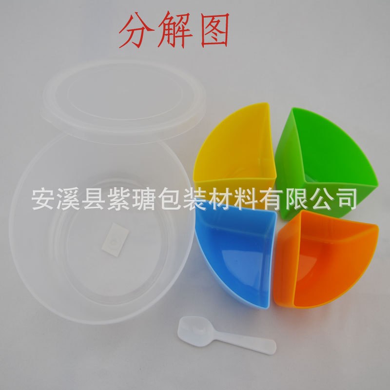 產品描述:本品采用新型的設計,將一個圓形的容器分成四個扇形截麵的容器,可以讓您分別存放四種不同的調味料,顏色鮮艷,既美觀大方,又很能節省空間。當然也可以用於存放實物,各自隔開,不會混合。也可將四個容器拿出來,作為一個保鮮盒使用,清洗也非常方便。是居傢的最佳選擇!