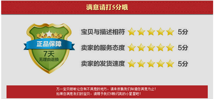 4、評價問題:評價:我非常重視每一位買傢的評價,力求做到服務上的 完美,如果您收到寶貝後覺得有什麼不滿意的地方,請先不要急於評價,迅速聯系店主詳談,一定會給 您一個妥善解決的方法,也請在為您解決問題後給出真誠的評價。