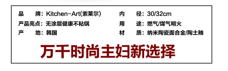 韓國原裝進口,納米陶瓷滲透層不粘鍋,無鍋蓋。不粘,環保,省火,省油。用完可用抹佈一抹便非常乾凈,省時省力。堅固耐磨耐用,加厚鋁合金鍋底,一體陶瓷滲透聚熱技術,電磁爐煤氣灶雙用,鋼琴烤漆,美觀時尚,鍋具無任何重金屬殘留,吃的健康,吃得放心~~ 不粘鍋中的戰鬥鍋