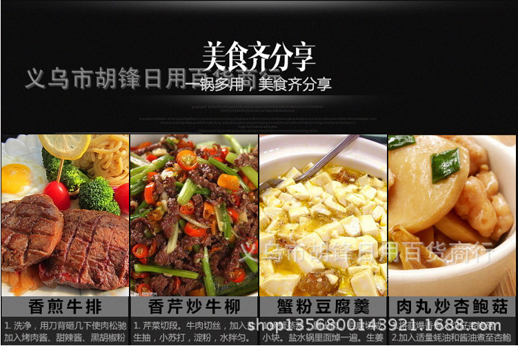 煎,烤。炒。煮。煲樣樣都行。而且沒有油煙。又不沾鍋。做出的美食原汁原味。營養不流失。最主要的是節能省電。比普通的炒鍋省電50%。多層復合底。不挑爐子。導熱快。受熱均勻。夏天特別好。食物做好都不用在放冰箱裡。放在鍋裡就可以。能保鮮5天。保證不變質。