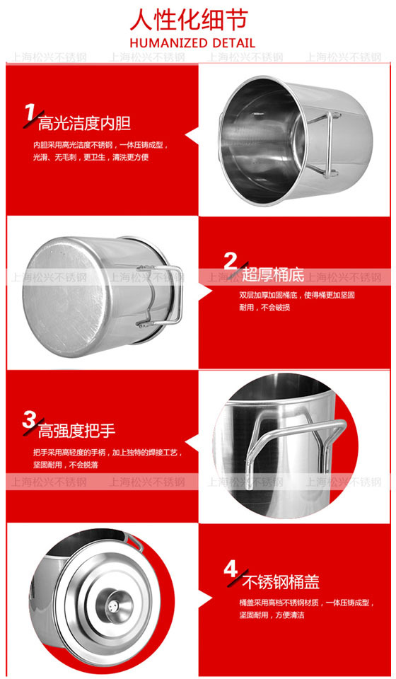 本產品采用食品級無磁201不銹鋼精製而成,采用的材料厚度為1.0mm、1.2mm、1.5mm和2.0mm。經過機器拉伸及拋光多道工序加工,加工過程難免有厚度損失,如要實際桶厚度1.0mm、1.2mm、1.5mm和2.0mm的請繞道而行,敬請諒解!