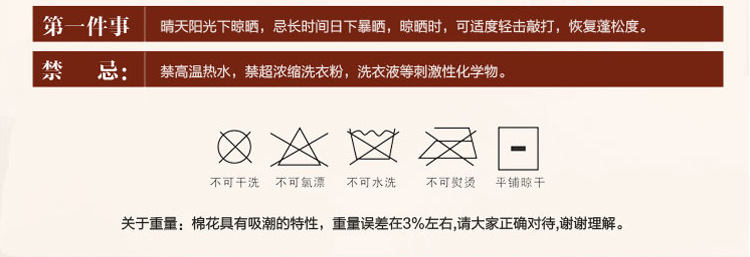 保暖性更強,更蓬松輕盈。本品不加任何網線,經100%純棉紗包裹手工縫製而成,不起灰,不飛絮,棉被更蓬松柔軟、輕盈貼身。