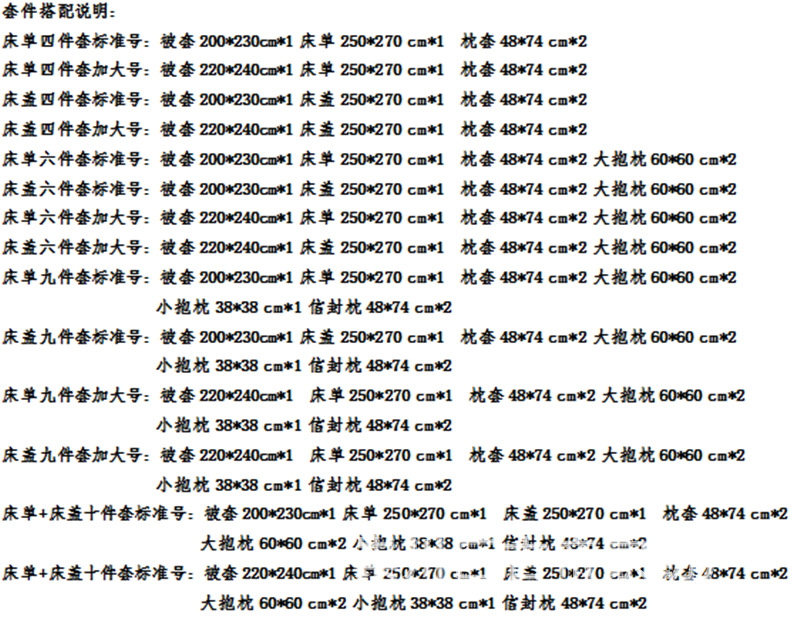 加大:被套220*240cm*1 床單250*270cm*1 枕套48*74cm*2