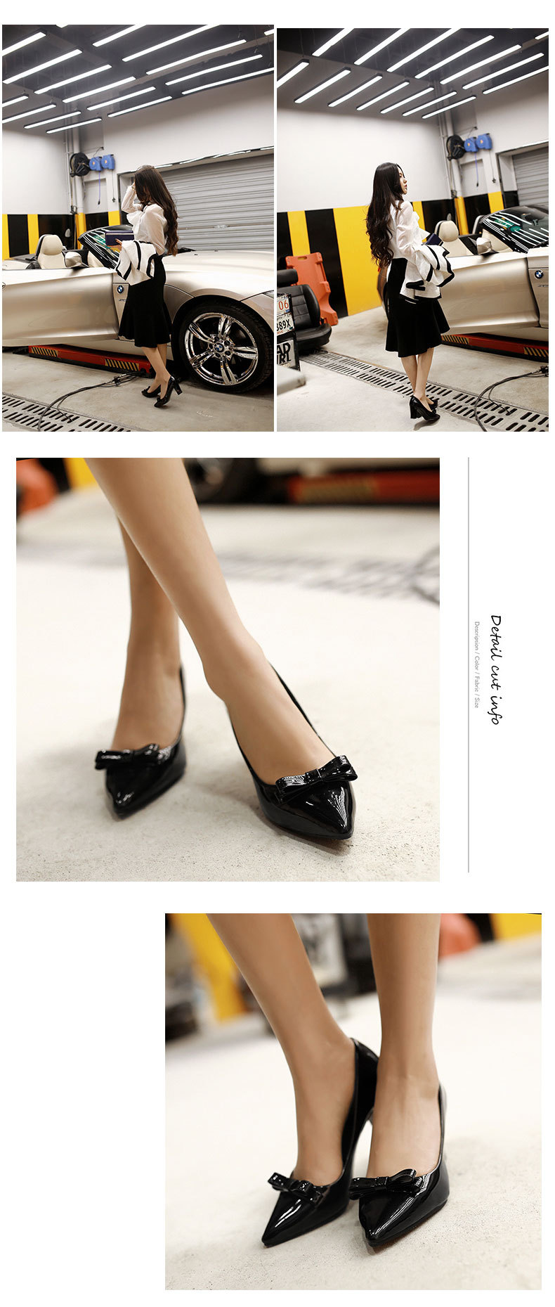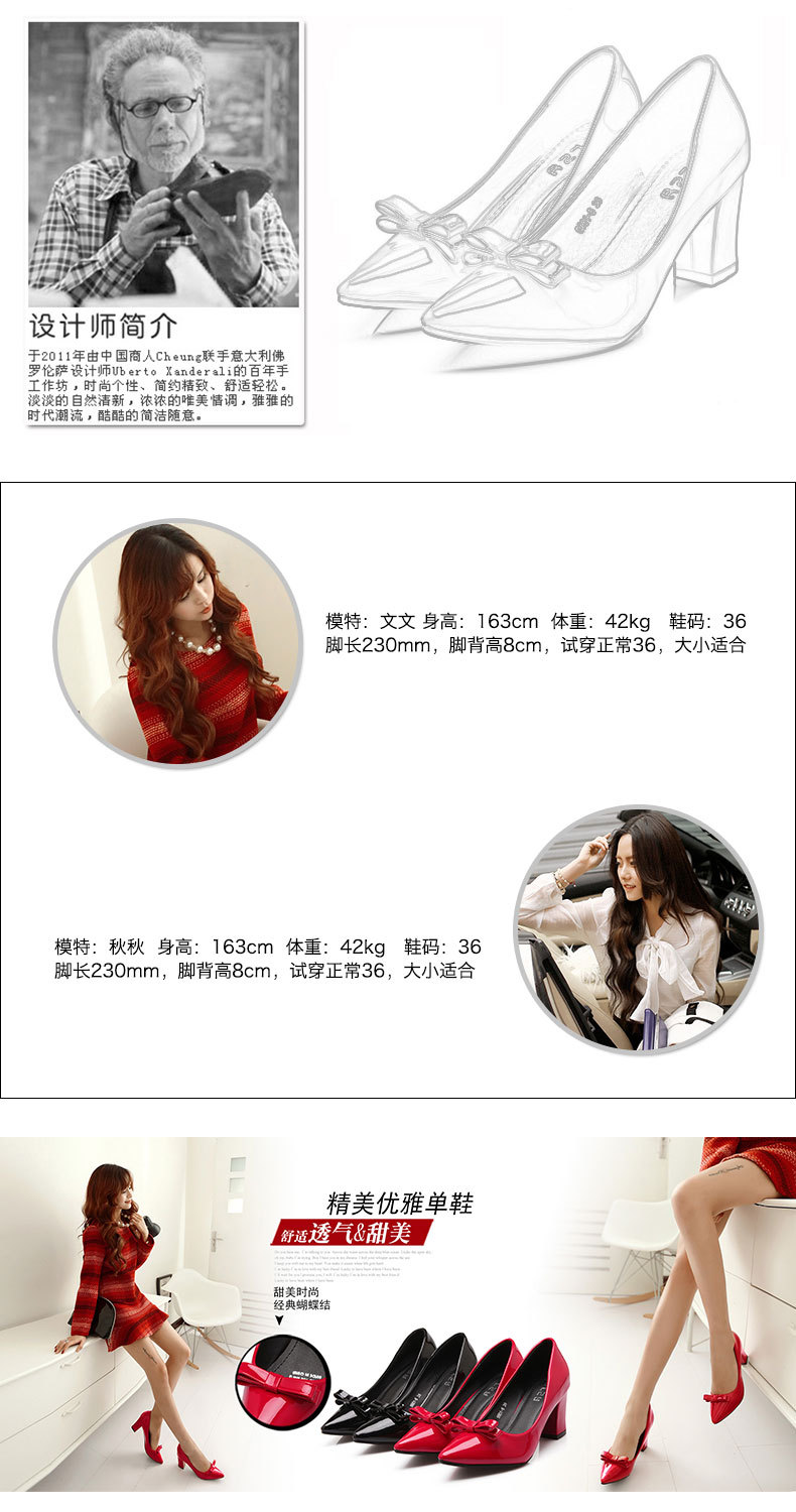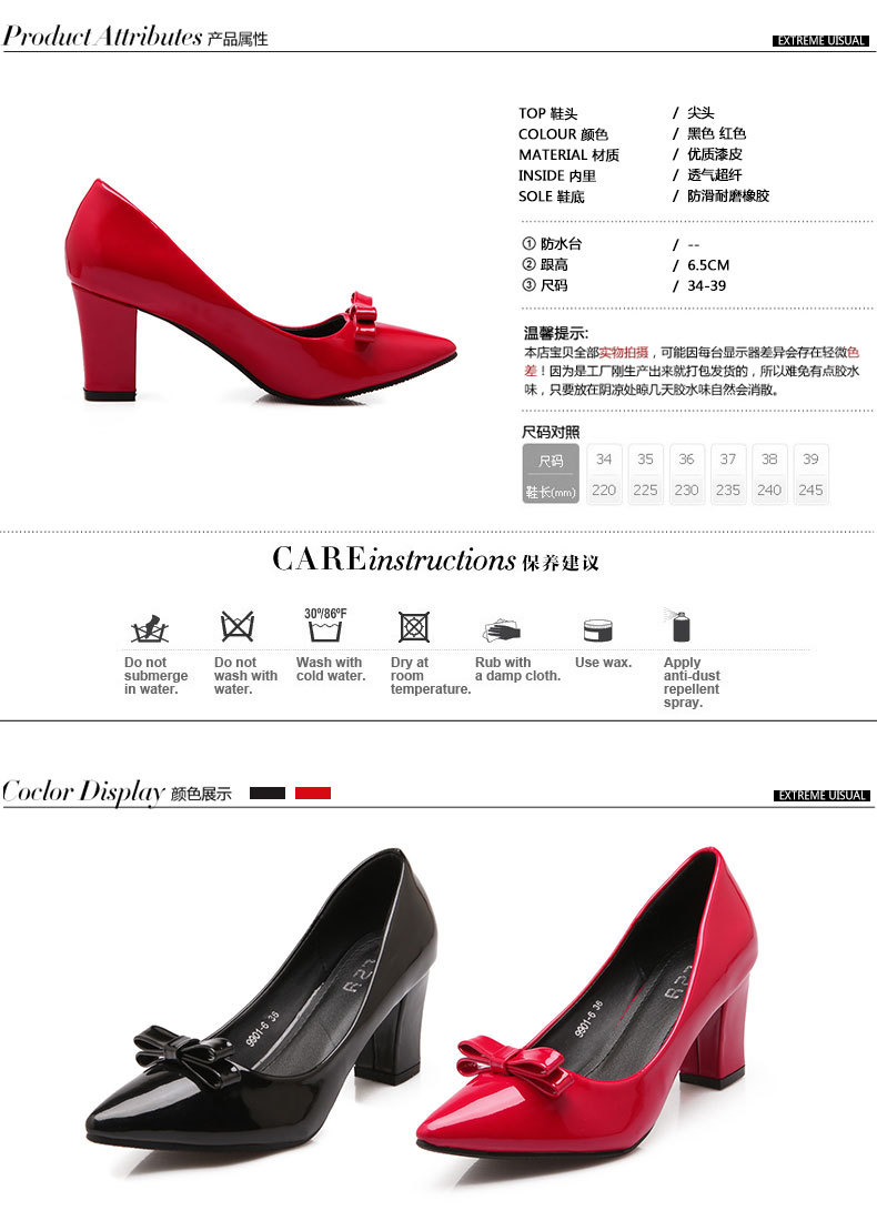 2015新款潮時尚女鞋歐美尖頭漆皮高跟鞋蝴蝶結粗跟鞋方跟女單鞋子