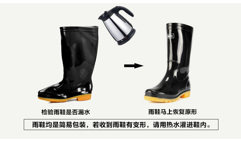 雨鞋裝箱包裝,倉儲運輸過程當中,難免會有一兩雙變形,采用方形紙箱包裝,避免變形,如到貨有變形,請自主將變形雨鞋燙熱水即可。