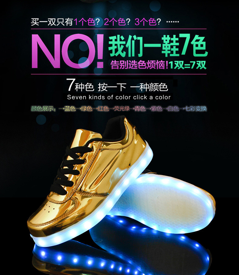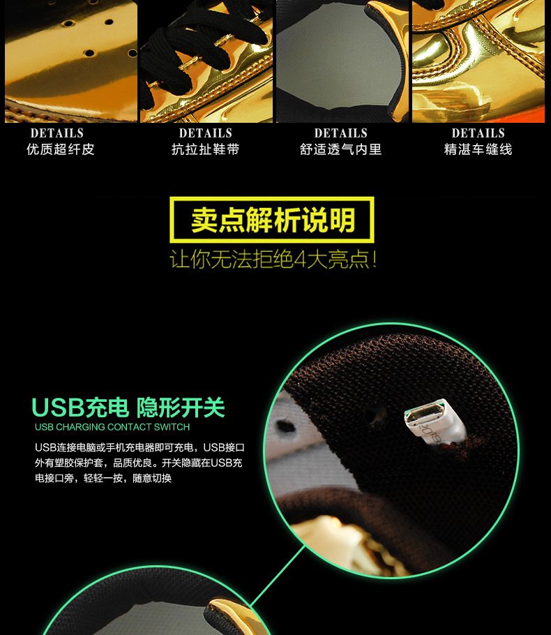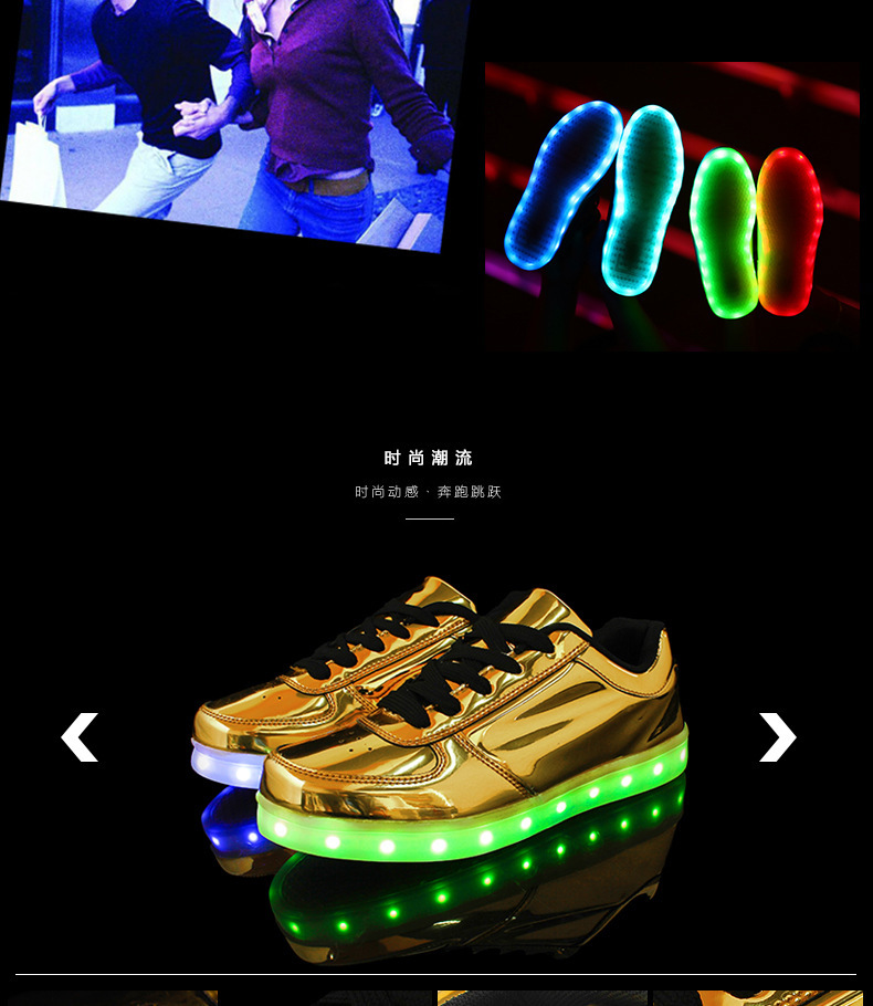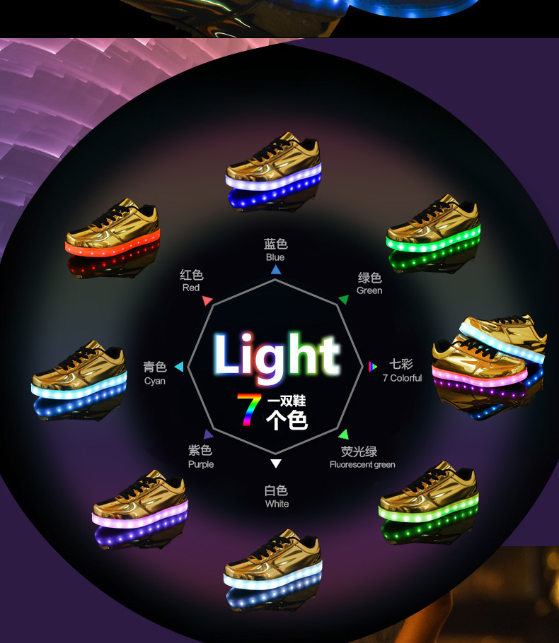 七彩USB充電LED發光鞋,有開關控製,能發七種顏色的光:還有【慢閃】—【快閃】—【爆閃】,一共11種模式。按一下變一種模式