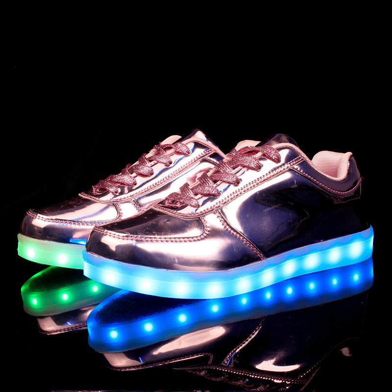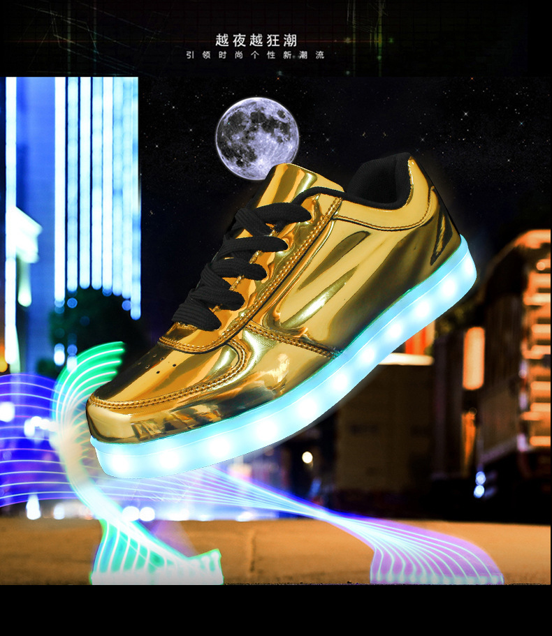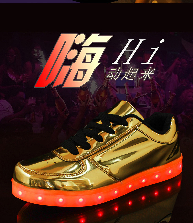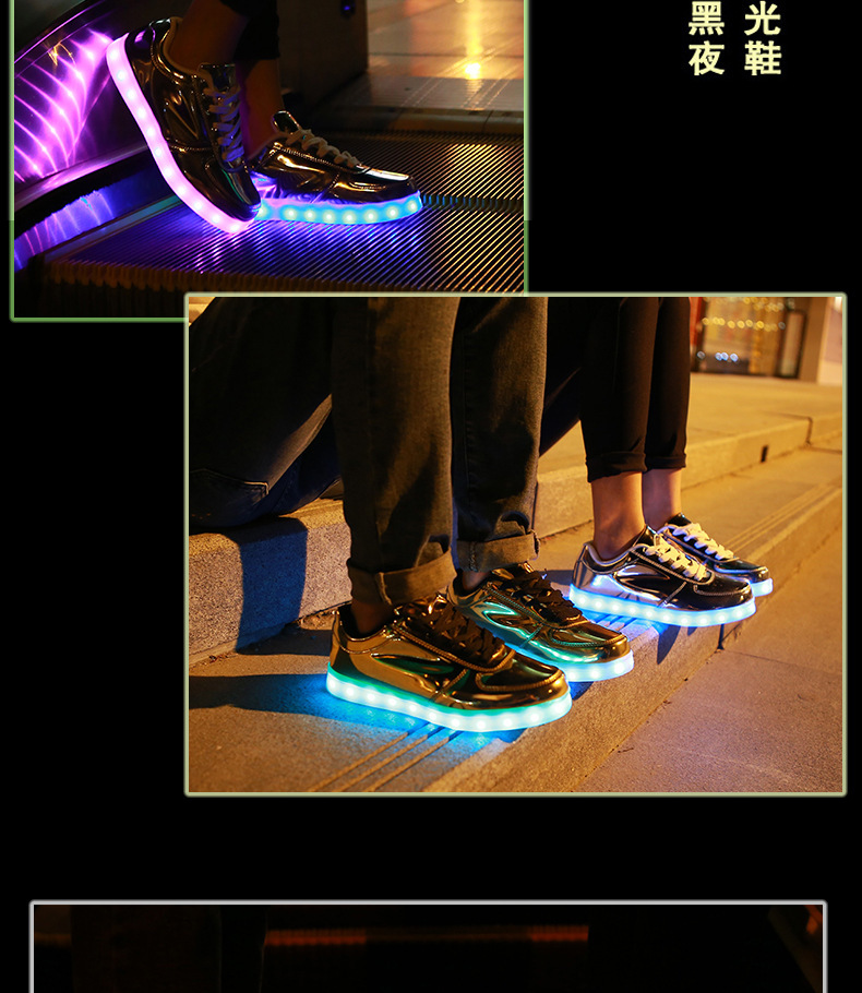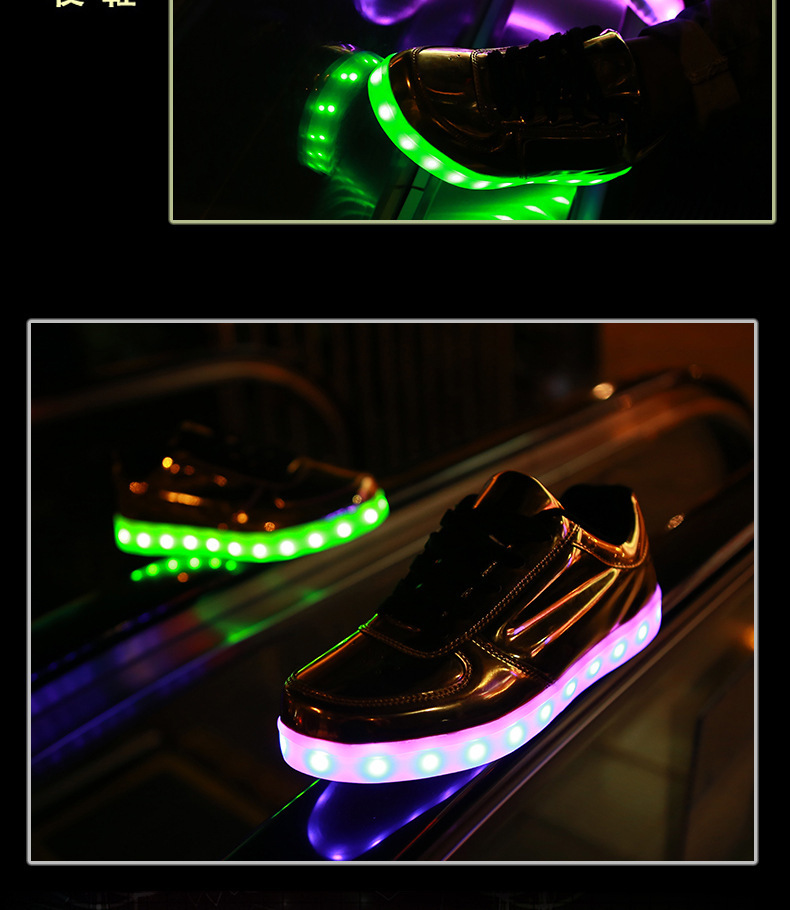 七彩USB充電LED發光鞋,有開關控製,能發七種顏色的光:還有【慢閃】—【快閃】—【爆閃】,一共11種模式。按一下變一種模式