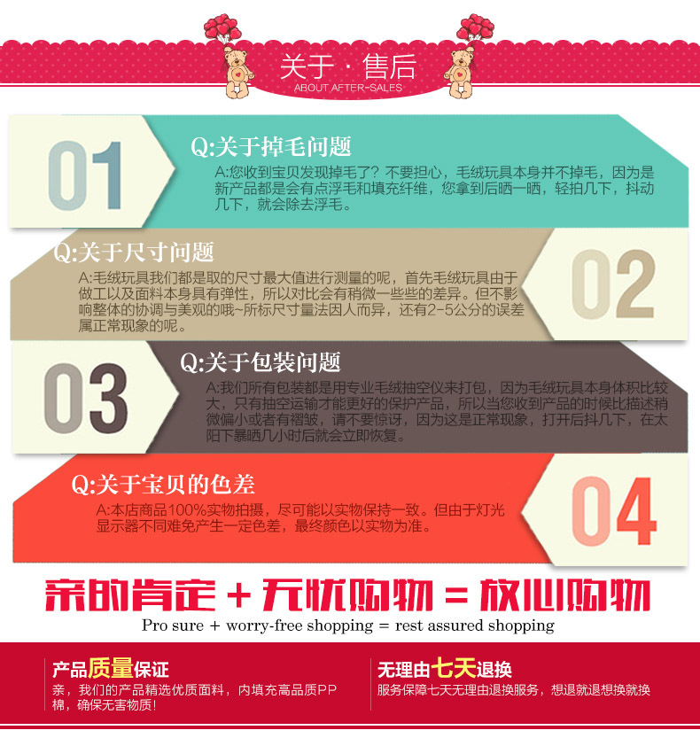 關於色差,尺寸:由於拍攝光線與顯示器等原因,圖片色彩與實際可能有細微差別,我們已經把色差降到最小,請不能接受細微色差的買傢謹慎拍下。關於尺寸我們的測量方法是將玩具平躺後從頭到腳測量(特殊形狀除外),測出值隻是大約值,因做工誤差和運輸擠壓等原因,實物尺寸與測量尺寸不可能完全一致,誤差值在10%以內不能成為退貨理由,謝謝!