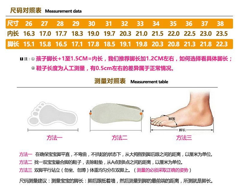 3、鞋子內長(不是鞋底長)因為條件有限,我們也是手工測量,以供大傢參考,因使用測量工具或方法不同會存在一定誤差,誤差0.5厘米之內,請諒解小誤差的存在,鞋子的話建議還是寧大勿小。