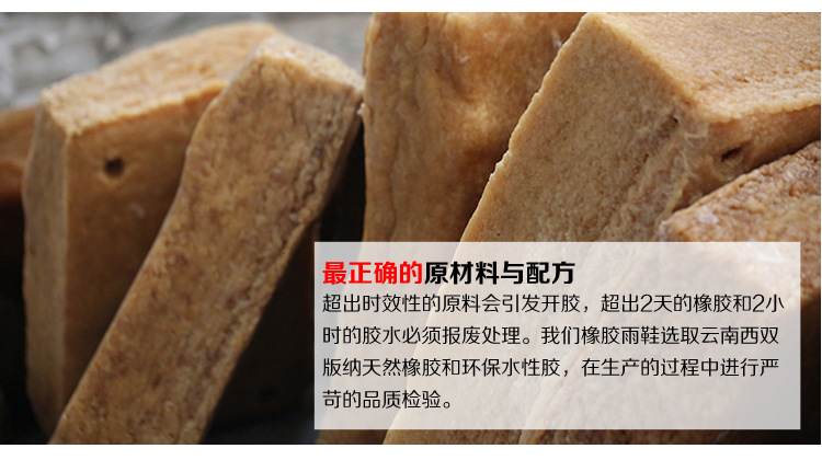 最正確的原材料與配方:超出時效性的原料會引發開膠,超出2天的橡膠和2小時的膠水必須報廢處理。我們橡膠雨鞋選取雲南西雙版納天然橡膠和環保水性膠,在生產的過程中進行嚴苛的品質檢驗。