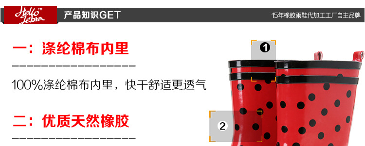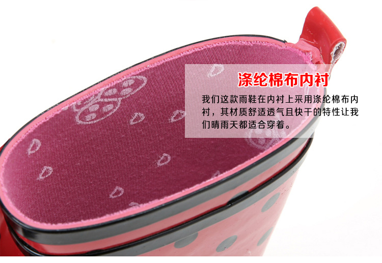 滌綸棉佈內襯:我們這款雨鞋在內襯上采用滌綸棉佈內襯,其材質舒適透氣且快乾的特性讓我們晴雨天都適合穿著。