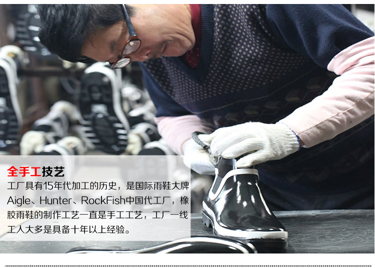 全手工技藝:工廠具有15年代加工的歷史,是國際雨鞋大牌Aigle、Hunter、RockFish中國代工廠,橡膠雨鞋的製作工藝一直是手工工藝,工廠一線工人大多是具備十年以上經驗。