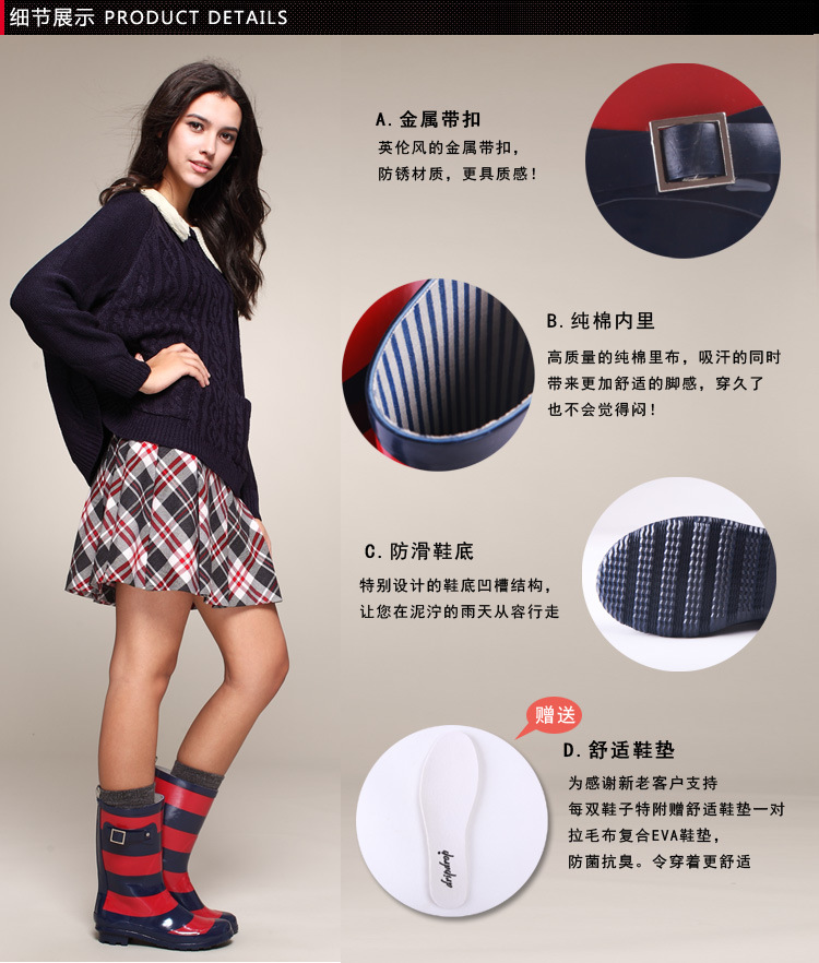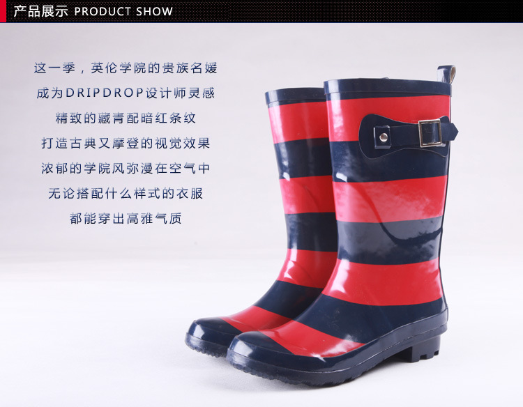 批發一路發提供客戶日本、大陸、香港、歐美【dripdrop】女條紋雨鞋 時尚可愛平底中高筒套橡膠雨靴水鞋套鞋批發、進口、代購的物流整合服務,針對機械、電子、半導體的零組件或機台設備等特殊性需客製化產品,我們也有各家工廠配合的専業工程師可回覆您的專業性問題。