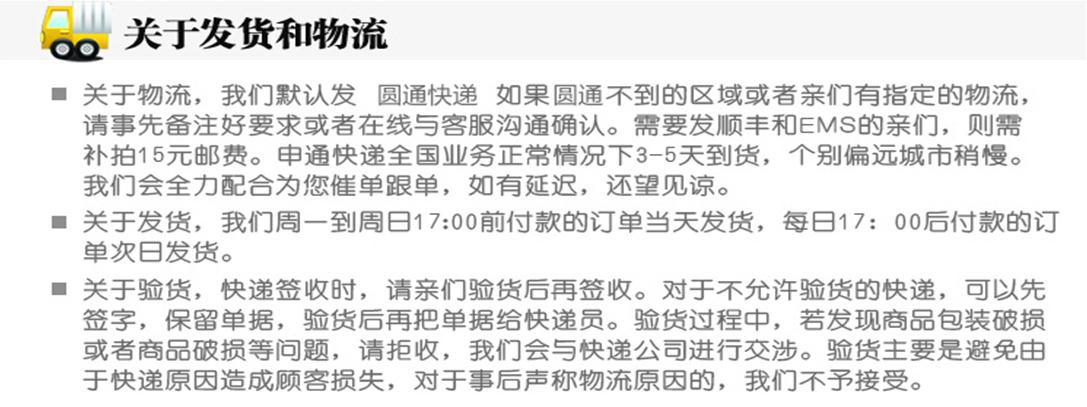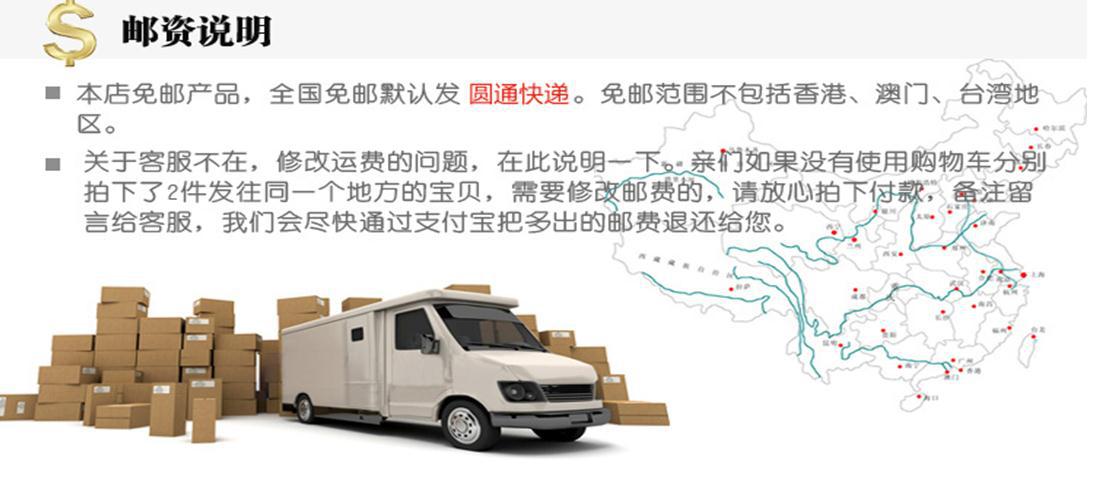 本店默認發圓通,若需要其他快遞,如順豐,請與客服聯系,發順豐需另加12-20元不等郵費,包郵產品隻包申通快遞,不包含順豐,不支持港澳臺,港澳臺隻支持順豐到付。