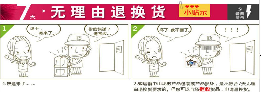 簽收前請驗貨哦,在快遞運輸過程中,難免會出現損壞,為盡量幫您節省時間,如若出現快件損壞情況,請直接拒收,並在第一時間與我們客服取得聯系,收到您拒收的件之後,我們會重新幫您補發。