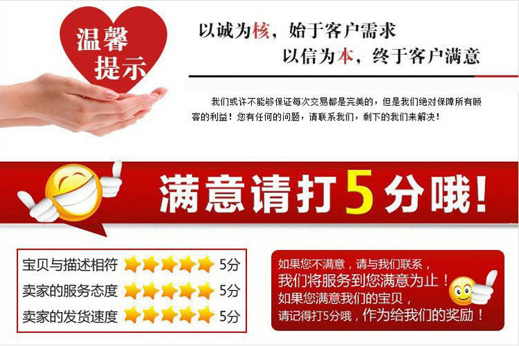 請每位客戶收到貨當場確認好數量和產品是否有問題,有問題的貨品請收到貨24小時內反饋到我們客服,我們會第一時間處理。收到貨後72小時內沒反饋問題的,本公司不接收處理,請每位新老客戶及時關註好這點,謝謝!