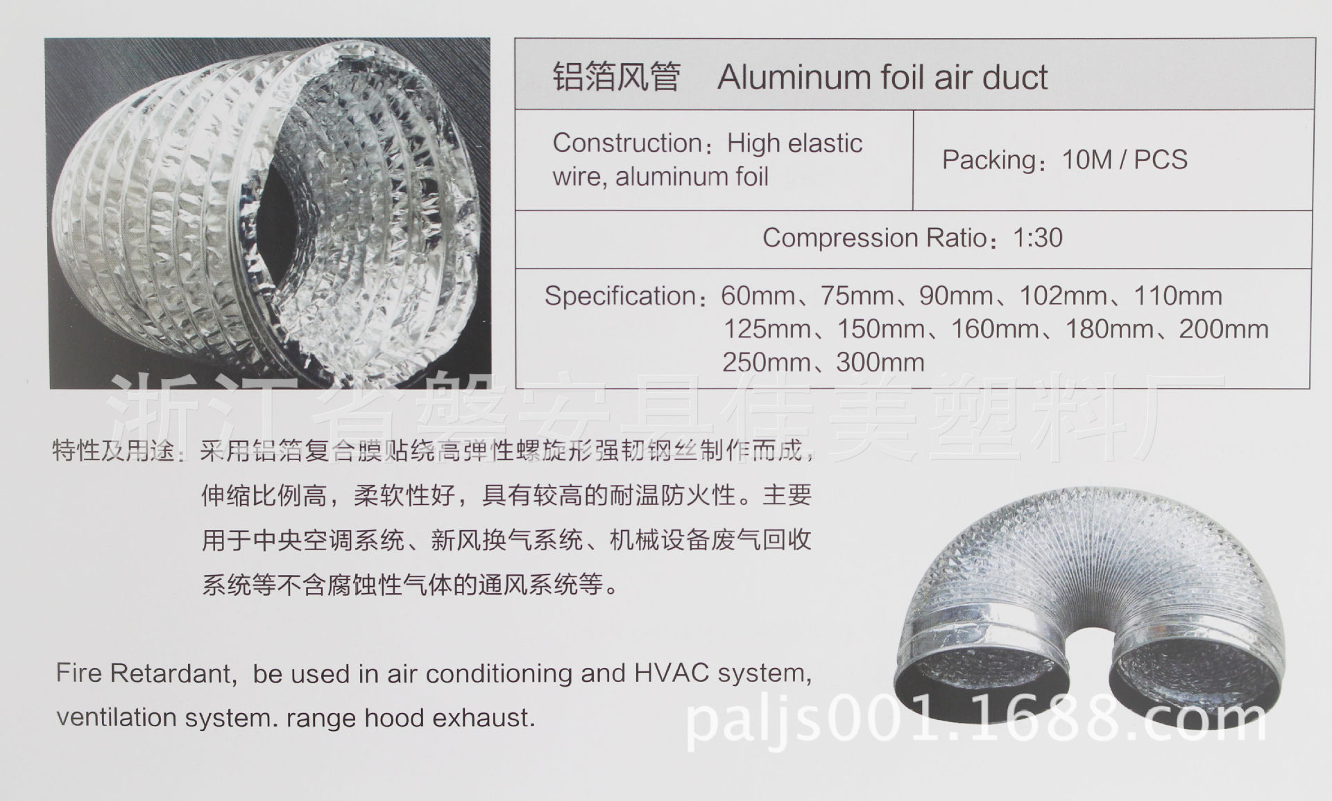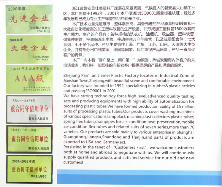 浙江省磐安縣佳美塑料廠本公司創建於1992年。是專業生產各種規格的空調器保溫排水軟管,洗衣機進排水管,吸塵器管,乾膚機彈簧伸縮管,脫排油煙機管,萬向伸縮管。 以及各種規格型號衛生器具排污管和與之配套的註塑件業務。