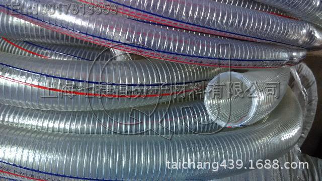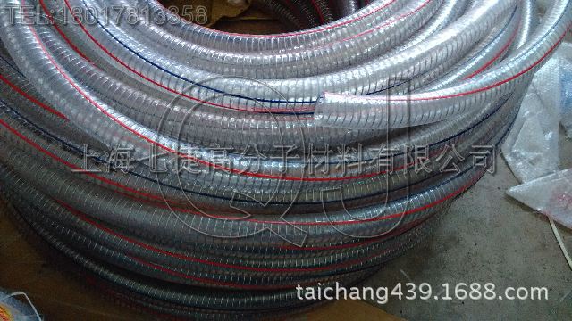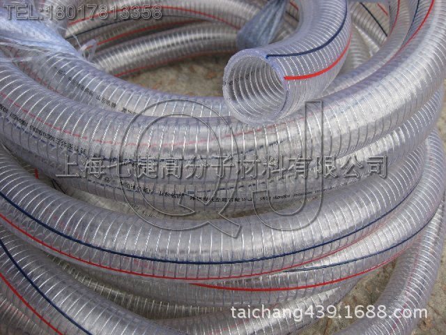 本產品為內嵌鋼絲骨架得PVC軟管,該產品質輕、透明(能看到管內液體流動)、耐候性佳、彎曲半徑小、耐負壓能力好。在真空及高壓狀態下能保持原形。可在管麵增加彩色標志線,更加美觀。
