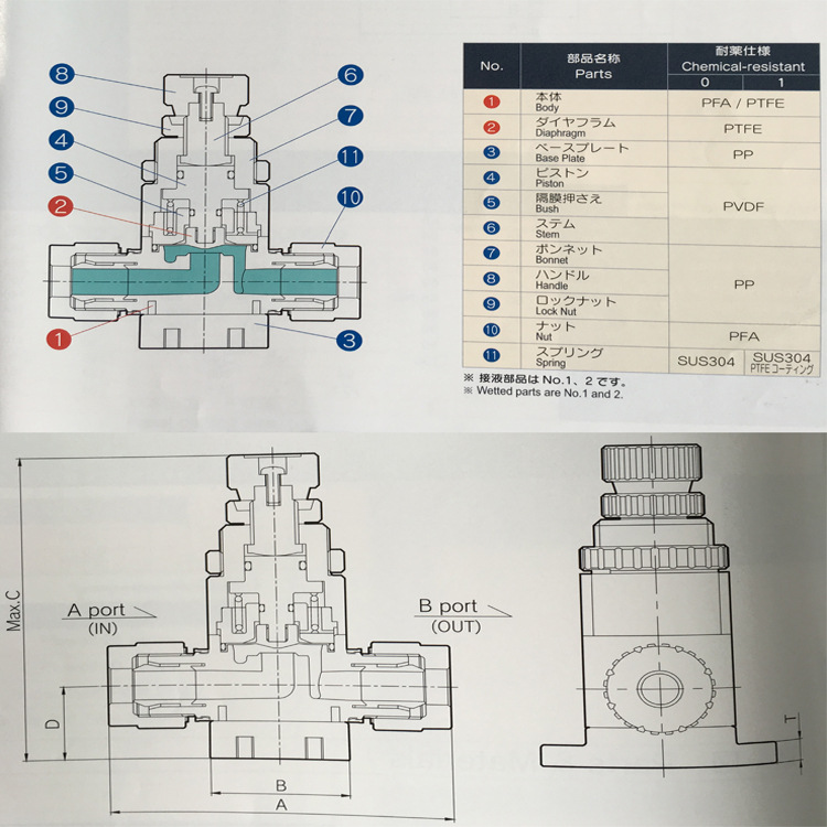特征描述閥門身體部分材質為高純PFA,與介質接觸到的部分全部為PFA材質.未和介質接觸到的部分:PFA,PVDF,18-8 SS等