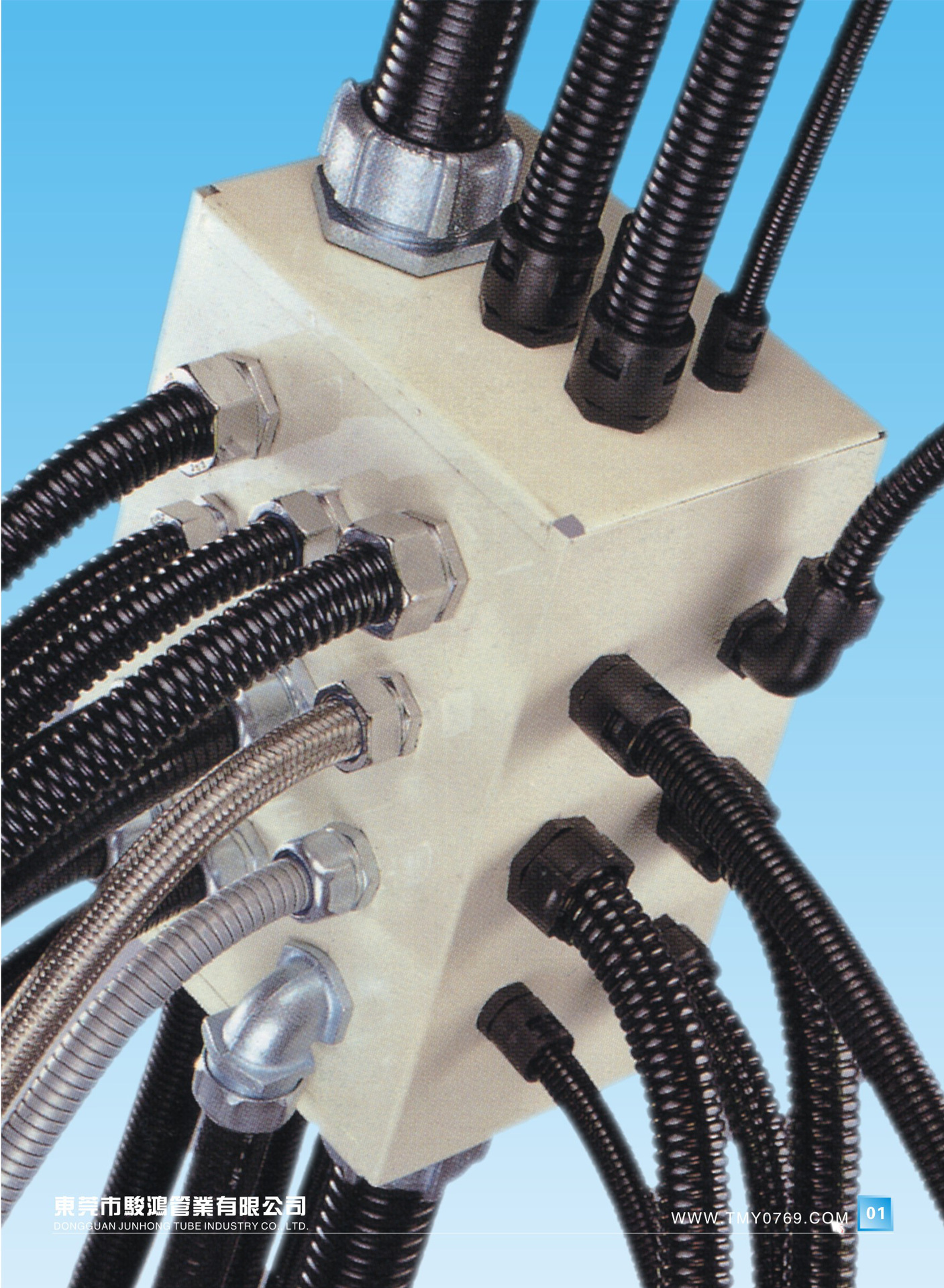 塑料波紋管(PA、PE、PP),廣泛用於機床機械及電箱控製櫃的走線連接,並有塑料快速接頭配套。產品規格有AD7.0、AD10.0、AD13.0、AD15.8、AD21.2、AD25.0、AD28.5、AD34.5、AD42.5、AD54.5,顏色黑灰及本色等,產品美觀、輕便、耐用,廣泛應用於汽車線束、電子、機械線束等領域,取代瞭原來的PVC及金屬護套產品,成為市場上用途廣泛的線束護套產品。