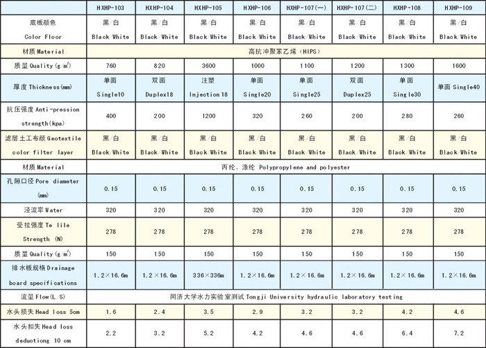 山東天海阻燃型防排水板的底板是用抗高沖擊及高抗壓聚苯乙烯(HIPS)、HDPE製成能抵抗長期高壓,不會產生變形。這種長久抗壓性不但能抵受混凝土底板重量及其荷重,並可抵受在施工期間不可避免的外來壓力及沖擊力,如車輛、工人踐踏及混凝土灌註沖力等。長期保持底板不變形,因而可維持原有的排水量。底板上的濾層土工織物用途是確保排水通道不會因外來物而阻塞,如回填土顆粒或混凝土。