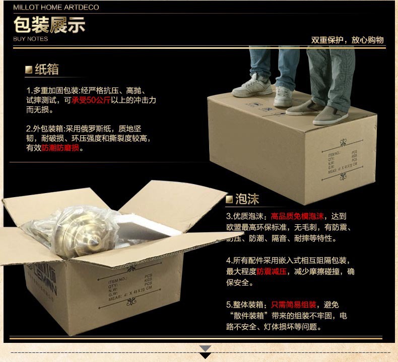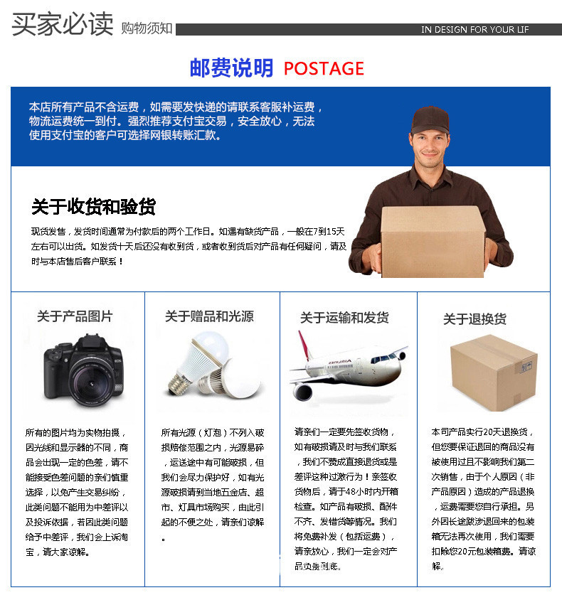 由於本廠燈飾藝術個性化,品種多,並非每款都有存貨,部分產品訂貨需一周到15天左右,有庫存的產品保證質量的原則下一般3天可以發貨,收貨後請在三天內開箱檢查,如有破損,配件不齊全,發錯貨等情況,請提供圖片證明,免費補發(包括郵費)