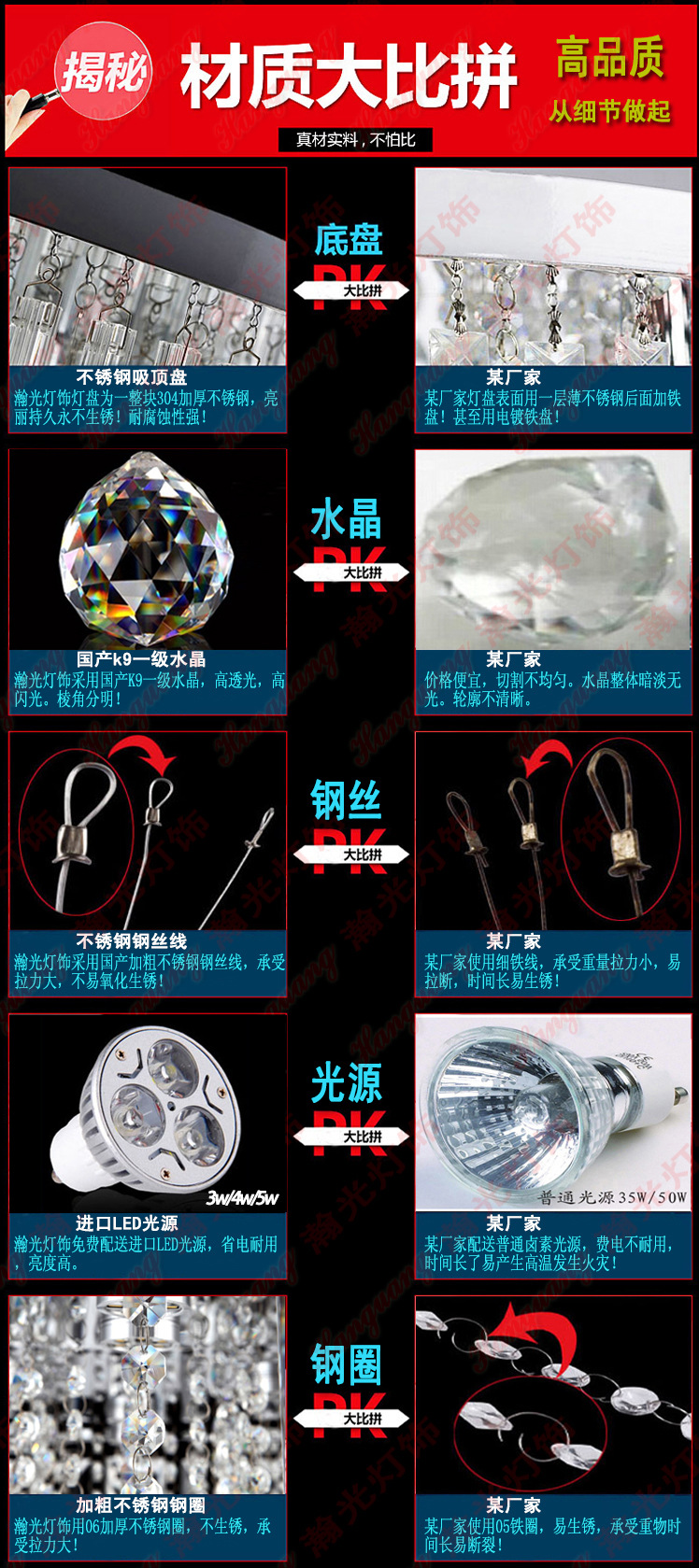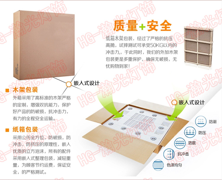 超值購物!!!配送LED光源!!! 廠傢直銷!凡在本店購物滿1999元,贈送 精美過道燈(樣式、款式隨意發放) 燈具尺寸:(可按要求定製,承接各類非標燈具) 您在本店選擇的這款K9水晶燈的優勢在於: 1、遙控器是國內知名品牌數位遙控器。(如要加裝請聯系客服補差價) 2、不銹鋼為進口鏡麵不銹鋼,讓燈體顯得更有質感; 3、用材料均為上等材料,不銹鋼扣環,不銹鋼線,高透光一級K9水晶! 4、免費為您打好木箱,確保發貨途中燈具的破損率減到最低; 5、此寶貝為瀚光品牌出口品質,遠銷與歐美市場,性價比超強 廠傢直銷,讓買傢買到既優惠又保證質量的產品。 你的滿意是我們的追求! 燈具若在物流運輸過程中損壞的,我們將負責到底,免費補發配件,讓您免去運輸 問題的擔憂,零風險購物。 保 修:超長5年保修,終身成本維護 顏 色:一級透明K9水晶+加厚優質鏡麵 材 質:一級K9水晶+優質鏡麵不銹鋼+3C認證電源線+優質陶瓷燈頭+ LED省電耐用光源+優質水晶鋼圈+銅材鍍鉻色水晶蝴蝶扣 適用范圍:客廳、臥室、餐廳、豪華別墅良好現代傢具照明 電壓功率:220V 包 裝:內放緩沖泡沫、五層牛皮紙箱打包、外層加固木架。 產 地:中山燈飾之都 (瀚光燈飾廠) 檔 次:打造出高檔典雅、尊貴大方、現代簡約豪華。 |