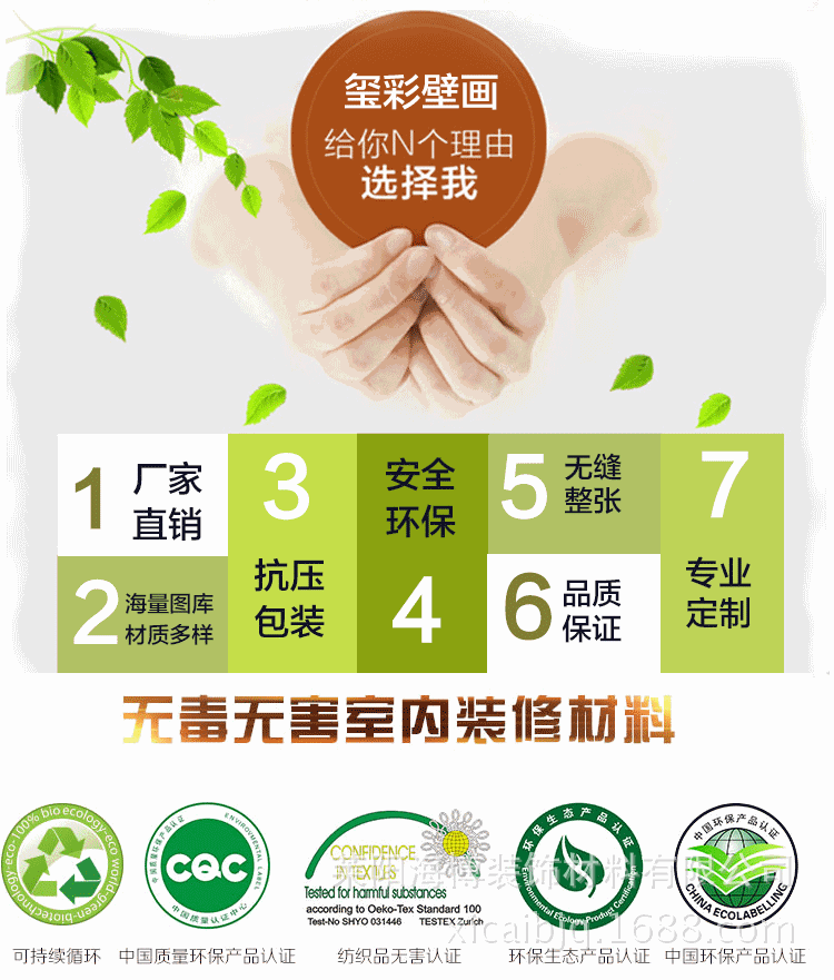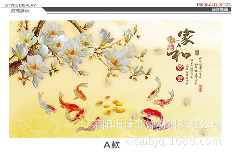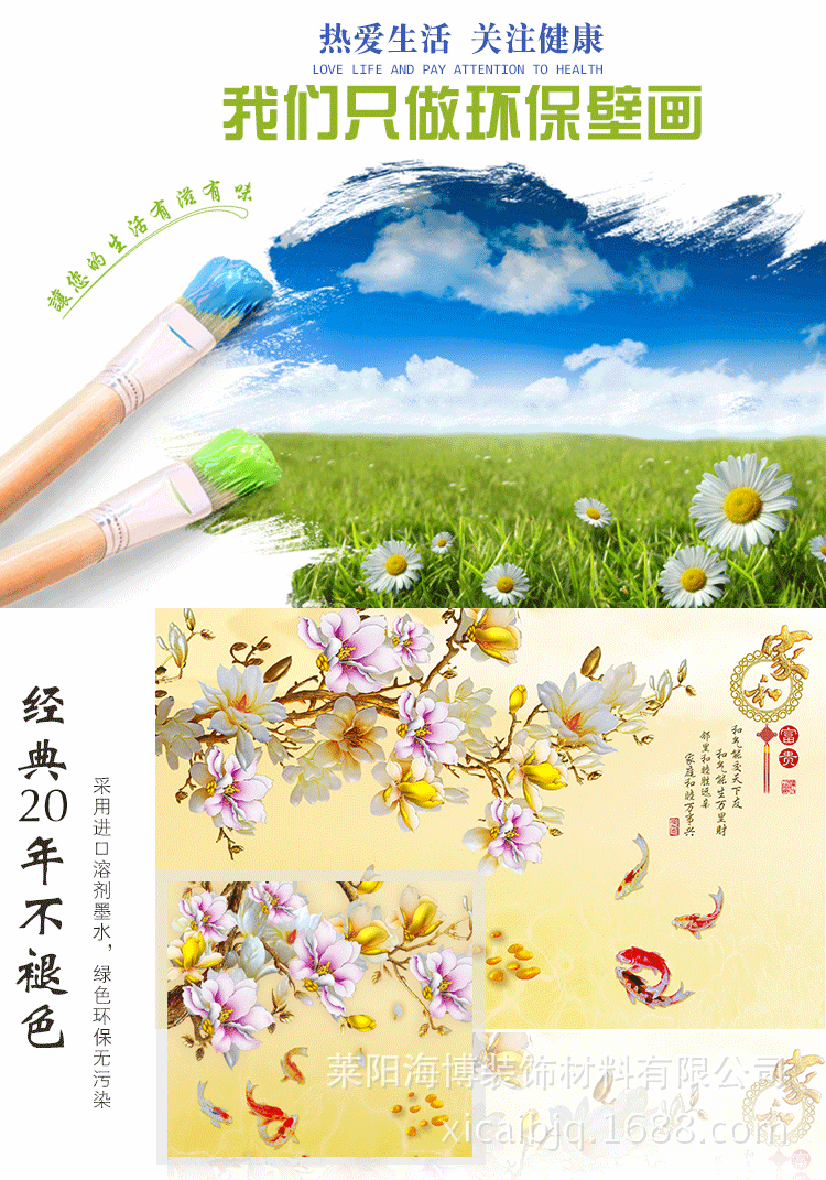 安裝說明:把免膠粉倒入盆中,加入一定比例的水,將免膠粉侵泡融化,用棍子將免膠粉攪均勻成漿糊狀(厚一些)。而後把墻麵整平清理乾凈,用滾筒把膠水刷在墻麵上(要刷均勻),兩個人把畫平鋪在墻麵上,調整好角度,從中間往四周用刮板刮平,(中間的氣泡要刮出來),最後用美工刀把壁畫四周多餘的佈料裁掉,中間有墻壁開關的地方用美工刀摳出來,一副漂亮的背景墻安裝完畢。不會的親可以來電咨詢:17085333388。