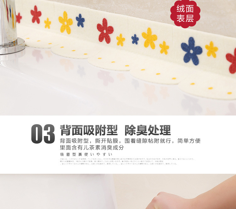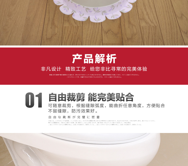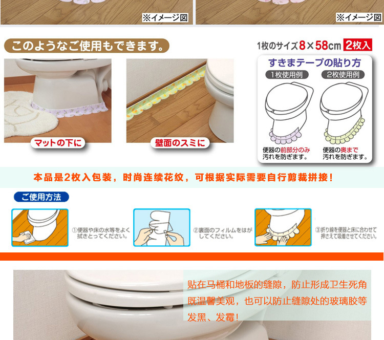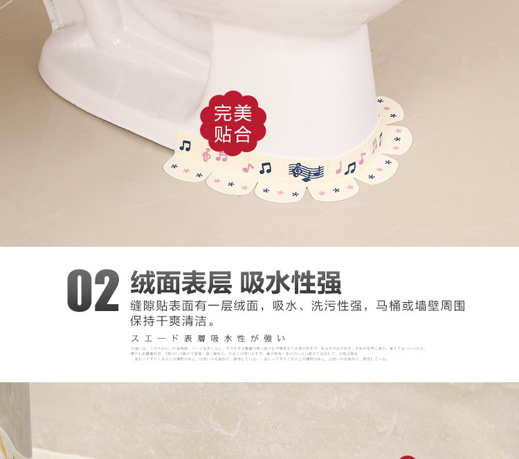 推薦:您傢的馬桶底座縫隙污漬是不是很難清理?試試我們傢這款日本原裝進口坐便器裝飾圈吧!表麵采用滌綸,背麵采用丙烯酸樹脂【兒茶素】做除臭處理,通常放在廁所馬桶腳下,不僅可以避免縫隙污垢還可以防止縫隙的污染氣味滲透哦!貼墻角更加衛生漂亮,可自由裁剪可機洗重復使用,很超值衛生的一款產品哦!一套2枚