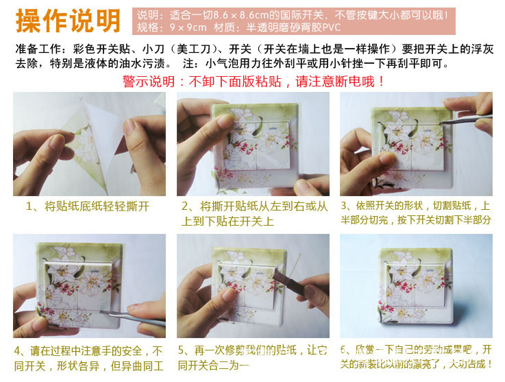 專業采用優等品PVC材料,每一張開關貼都有獨立OPP袋子包裝,顯的美觀大方。