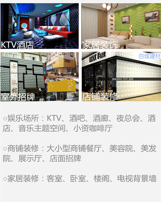 - 佛山百城建材有限公司產品廣泛應用於商場,KTV,客廳,餐廳,臥室藝術擺件以及辦公等,酒店包間,高檔餐飲,婚紗影樓背景墻,高級會所,咖啡廳,茶座等門口及大廳公共區域藝術裝修。
