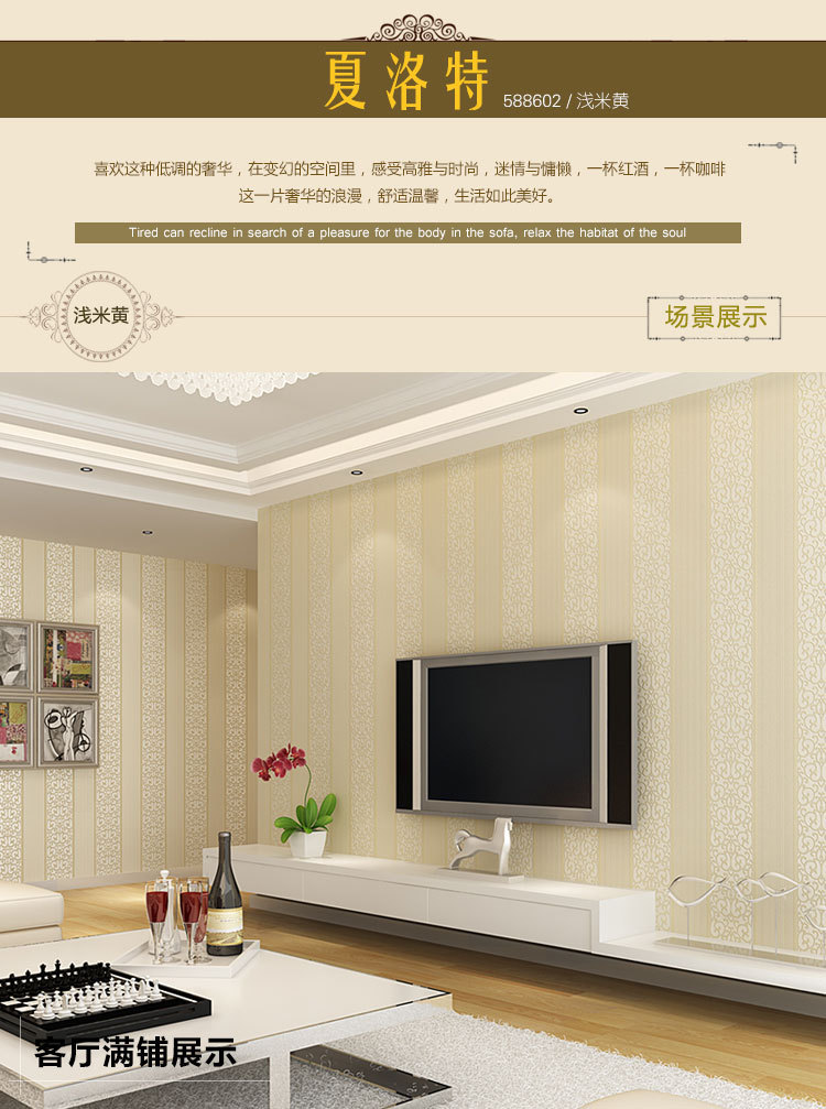 環保壁紙,厚實,柔軟抗鄒,透氣防潮,打理方便,適用范圍客廳,過道,臥室等