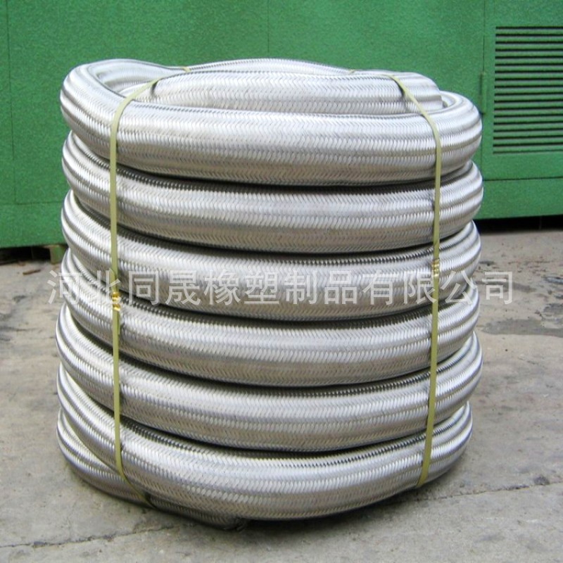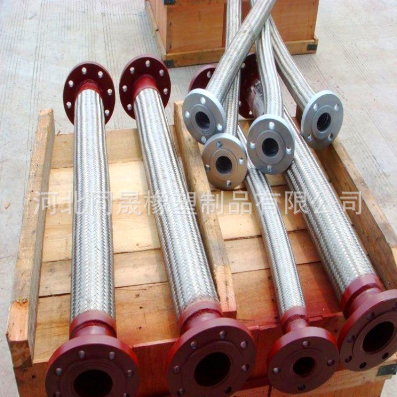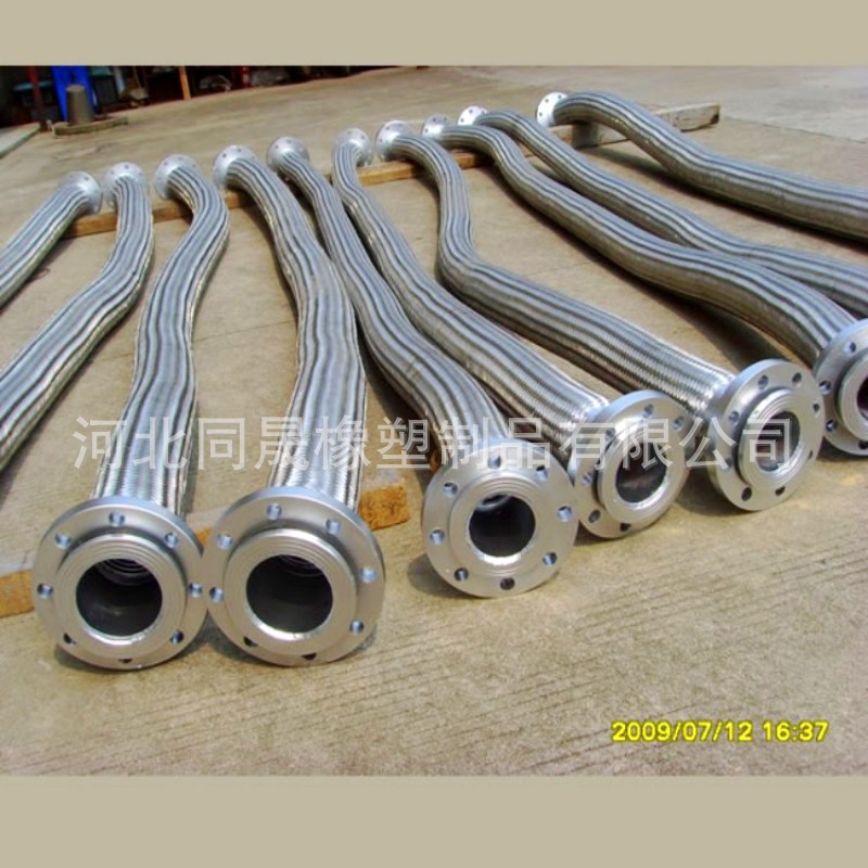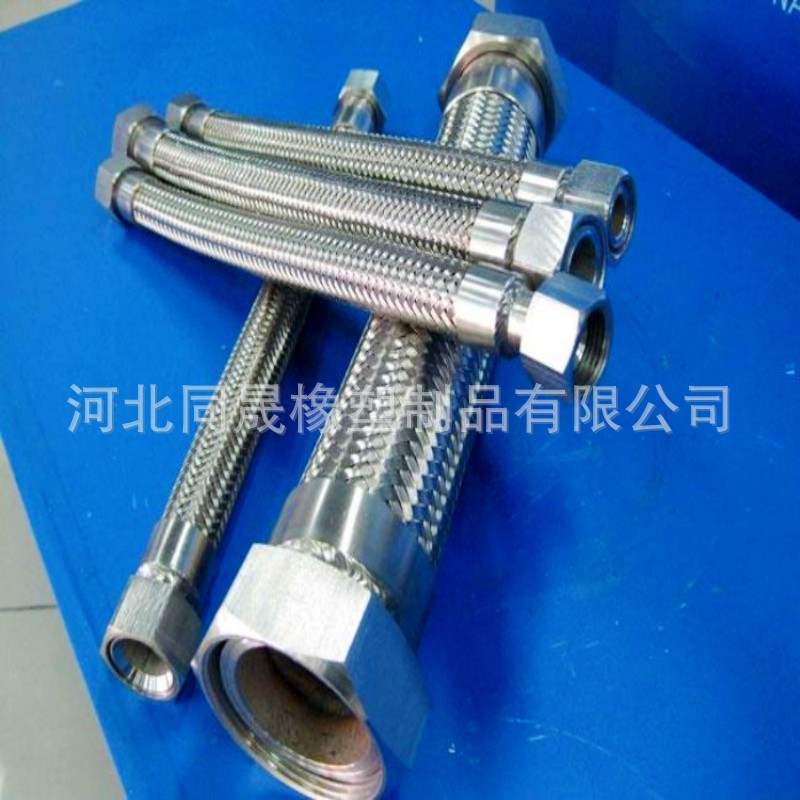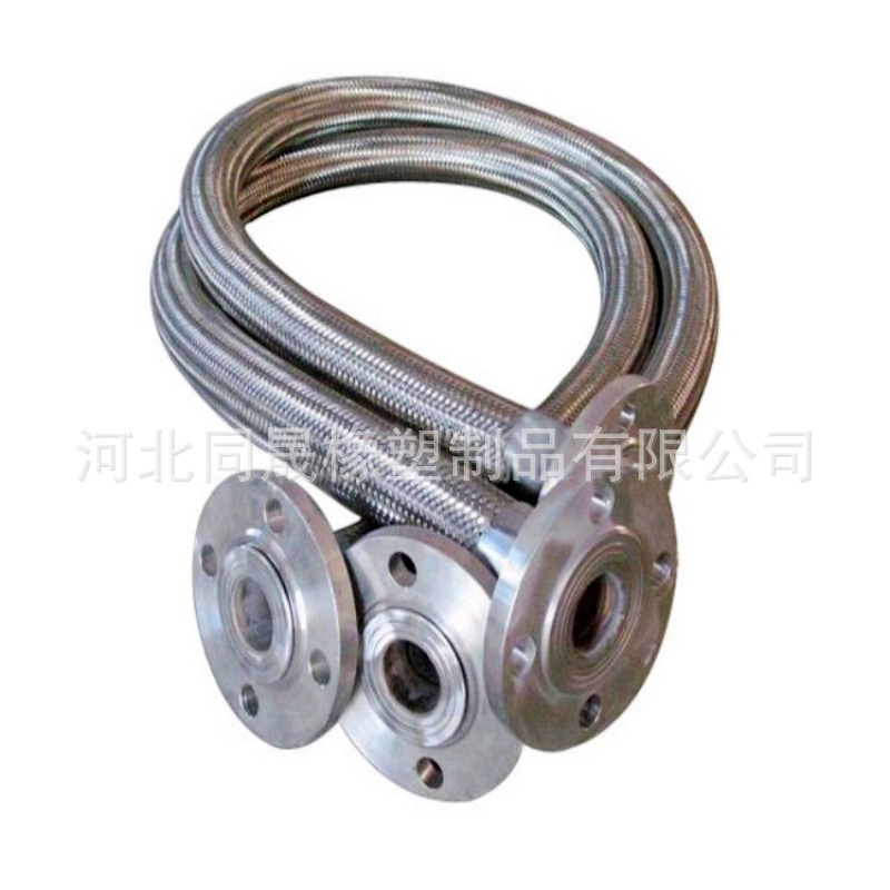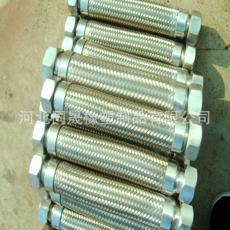 不銹鋼金屬編織軟管具有耐腐蝕、耐高溫、耐低溫(196℃~-420℃)、重量輕、體積小、柔軟性好等特點。應用於航空、石油、化工、冶金、電力、造紙、醫藥、食品、木材、煙草、交通等行業。金屬軟管采用奧氏體不銹鋼材料或按用戶要求的材料製造,具有優良的柔軟性,耐蝕性,耐高溫性(-235℃ ~+450℃),耐高壓性( 高為32MPa),在管路中可對任何方向進行連接,用以溫度補償和吸收振動、降低噪聲、改變介質輸送方向、消除管道間或管道與設備間的機械位移等,雙法蘭金屬波紋軟管對有位移、振動的各種泵、閥等的柔性接頭尤為適用金屬軟管(簡稱軟管)是現代工業管路中一種高品質的柔性管道。它主要由波紋管、網套和接頭組成。它的內管是具有螺旋形或環形波形的薄壁,波紋管外層的網套,是由不銹鋼絲或鋼帶按一定的參數編織而成。金屬軟管兩端的接頭或法蘭是與客戶管道的接頭或法蘭相配的。金屬軟管適用范圍:需要充分撓性的輸送管,防止振動處所配管,對蒸汽、煤氣、空氣、重油、石油、化工藥品類等均適用。 螺紋式 通徑為50毫米以下的金屬軟管的接頭,在承受較高工作壓力的情況下,多以螺紋式為主,當擰緊螺紋以後,兩個接頭上的內、外錐度麵緊密配合。法蘭盤式通徑為25毫米以上的金屬軟管的接頭,在承受一般工作壓力的情況下,以法蘭盤式為主快接式 通徑為100毫米以下的各種金屬軟管的接頭,在要求快速裝卸的使用條件下,一般采用快接式。