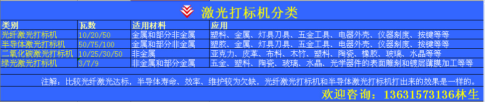 光打標機,紫外激光打標機,端麵泵浦激光打標機,半導體側泵激光打標機、激光打標機、激光焊接機、小功率CO2激光切割機等三大類型二十幾種型號的工業激光設備,部分產品遠銷加拿大、美國、日本、韓國、越南、伊朗、印度等國傢。並為多傢國內外企業提供瞭完善的激光應用解決方案。 產品廣泛應用於電子、IC芯片、電工電器、照明燈具、珠寶首飾、五金工具、衛浴潔具、機器機表、汽摩配件、手機通訊部件、模具、精密機械、醫療器械、IT數位金屬外殼、軍工航空部件、服裝皮革、工藝禮品、廣告裝飾、模型、炊具餐具、廚具等行業。並可根據客戶需求提供各種自動化在線激光打標、激光焊接、激光切割設備。