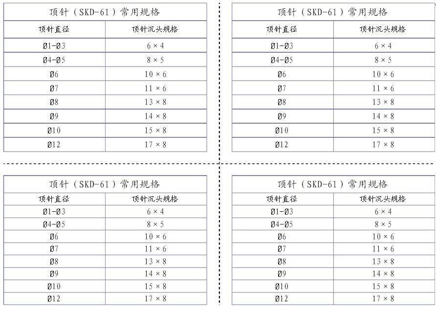 SKH51頂針韌性較SKD61較優;SKD61頂針可以耐1600℃高溫,SKD61頂針表麵氮化處理後可以很好的提高頂針的耐磨性.