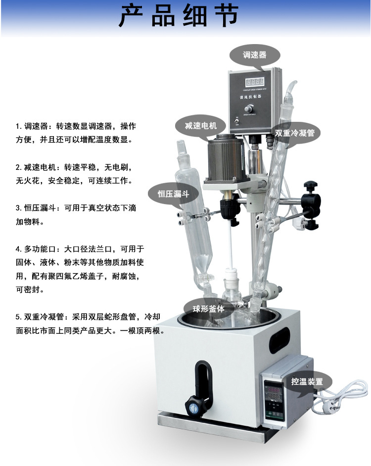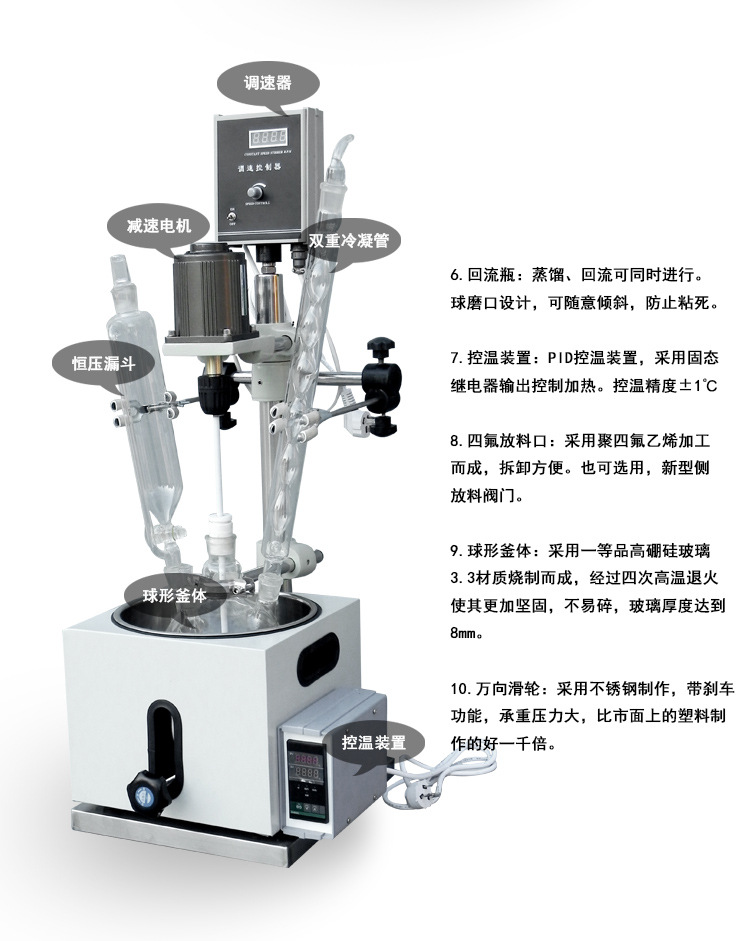 F系列單層玻璃反應釜(器)可在恒溫條件下進行各種溶媒合成反應,機器反應部分為可操控全密封結構,可利用負壓連續吸入各種液體和氣體,也可在不同溫度下做回流或蒸餾.