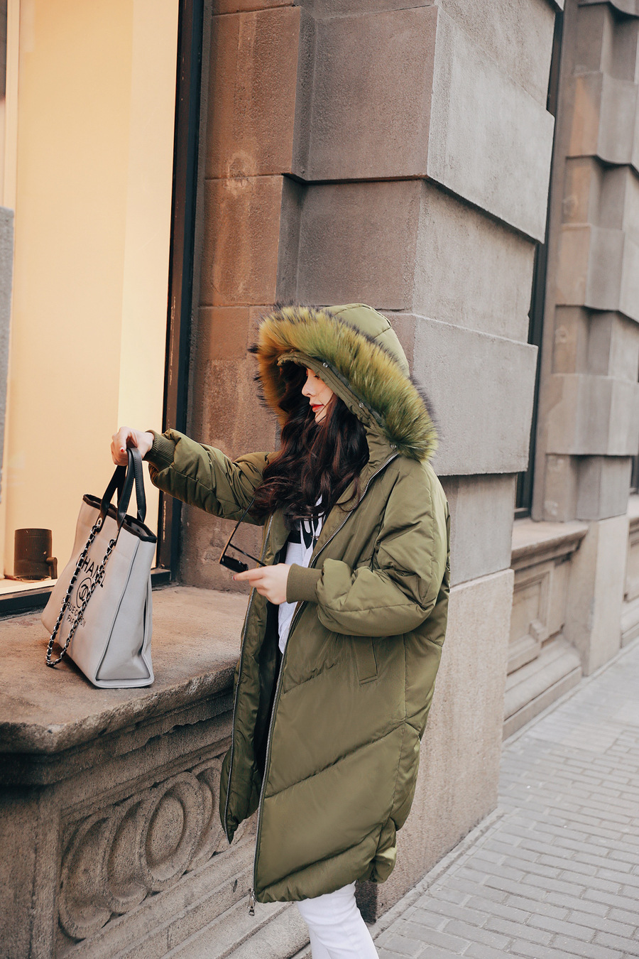 L:前衣長:102cm 後衣長:107cm 連肩袖長:75cm 袖口(螺紋):20cm 胸圍:124cm 下擺:122cm