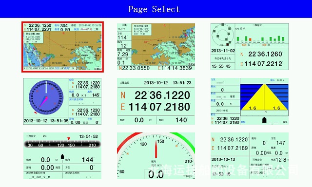本機有海圖屏(模式一)、海圖屏(模式二)、衛星屏、羅盤屏、定位屏、公路屏、掌舵屏、方位屏、綜合信息屏共九個畫面,可通過【DISP】鍵、【模式】鍵和【菜單】鍵進入。
