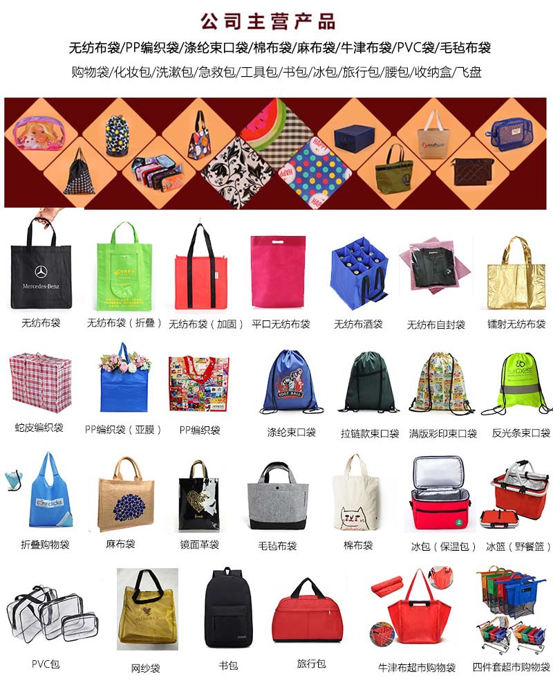 | 佈料品質: | 無紡佈、牛津佈、滌綸佈、棉帆佈、黃麻、毛氈、網紗等,根據客戶需要進行定製 |