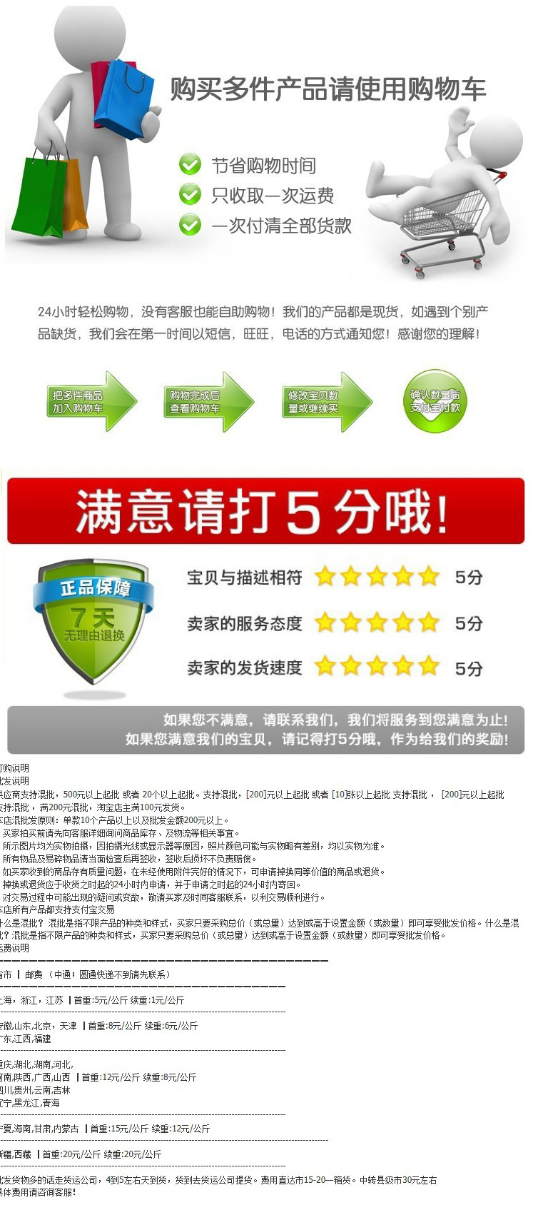 關於快遞:本店默認快遞為申通、快捷快遞,港澳臺客戶發順豐。如有特殊要求,請您主動與我們的在線旺旺聯系,並備註下,不聯系和無備註的,我們都默認發申通、快捷。郵費按快遞公司收費標準收取,如對其合理性有異議。可登錄各快遞公司官網查詢。大件客戶可與旺旺聯系發物流。謝謝!