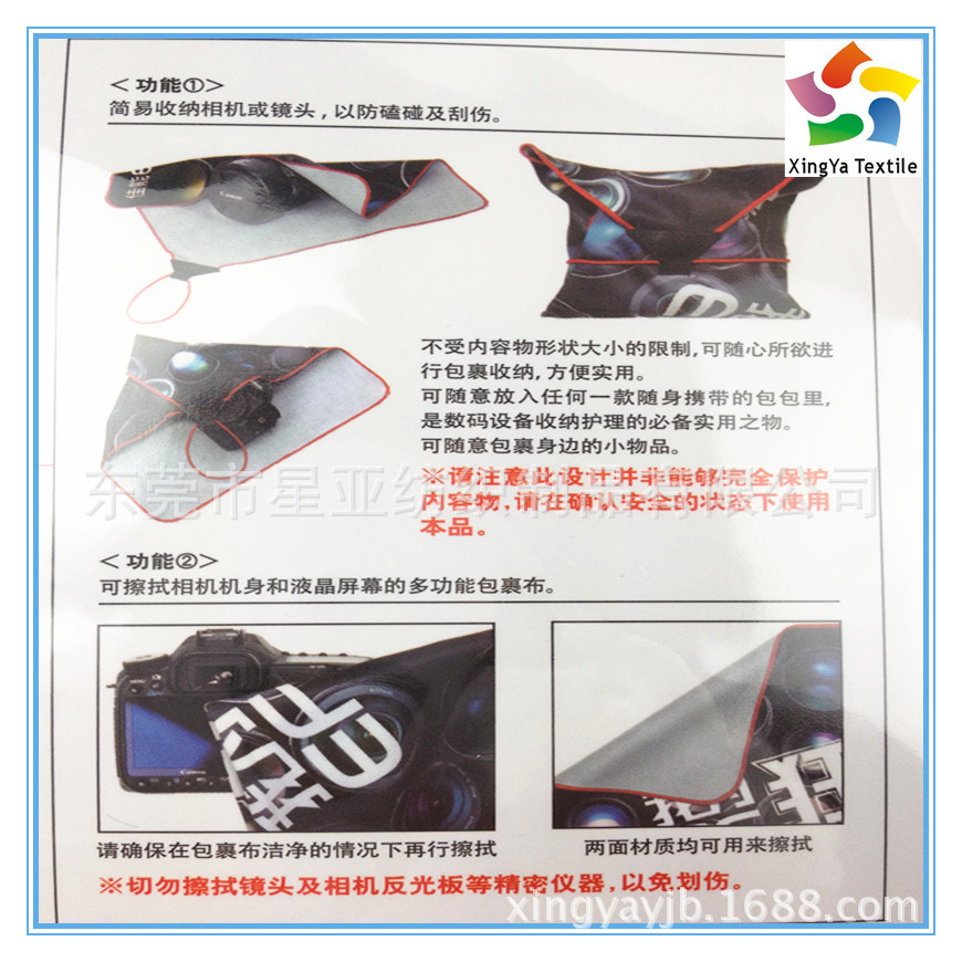 - 此款產品全部采用超細纖維高質量材料製作而成,一麵是全滌超細纖維針織佈、另外一麵是超細纖維毛圈清潔佈復合而成,手感柔軟,二麵均可擦拭高精密鏡頭及高光麵的機身表麵,不刮花,不掉毛。不同於市麵上普通的包裹佈,是您高大上的數位產品首選贈品哦!
